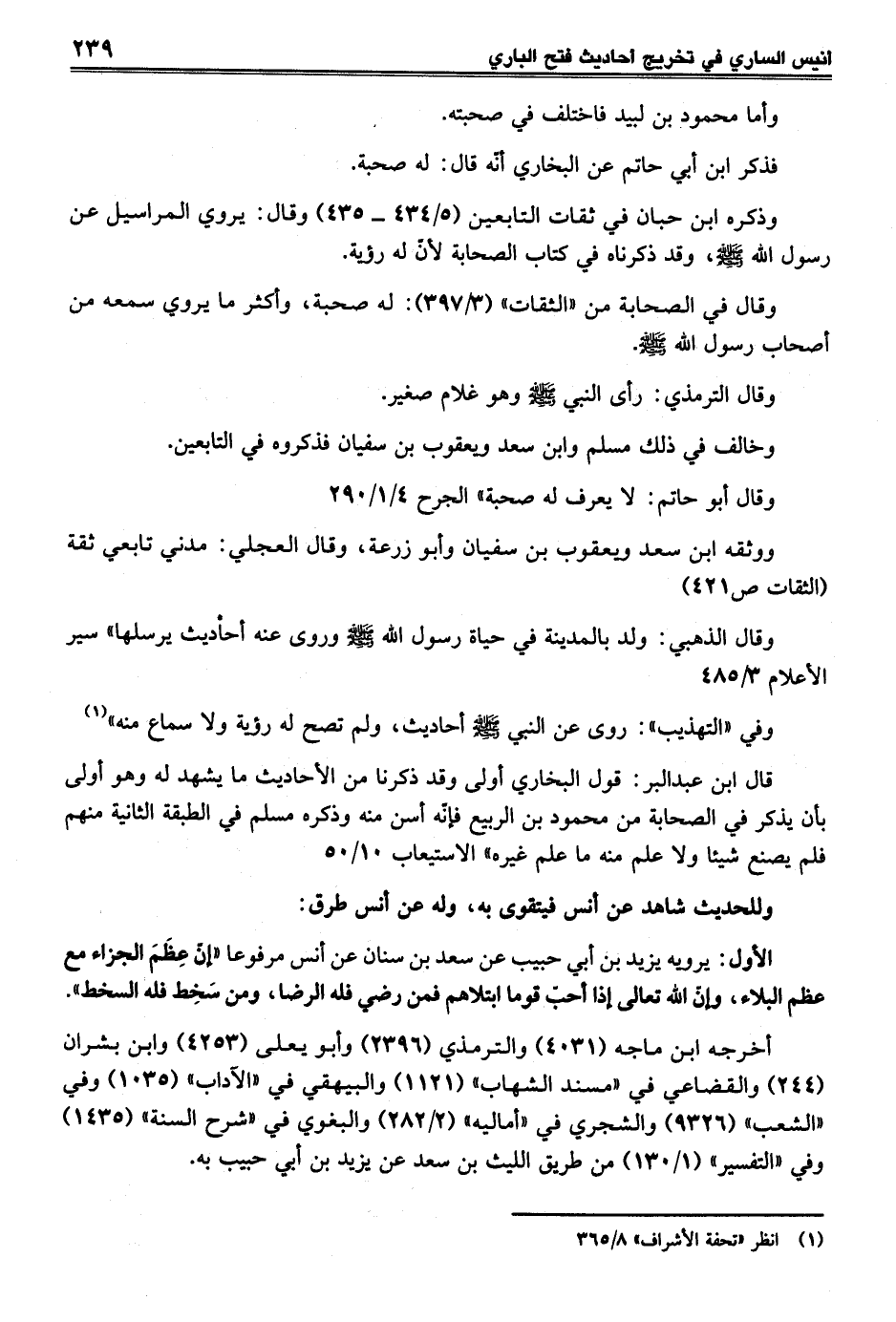 قال ابن عبد البر: قول البخاري أولى وقد ذكرنا من الأحاديث ما يشهد له وهو أولى بأن يذكر في الصحابة من محمود بن الربيع فإنّه أسن منه وذكره مسلم في الطبقة الثانية منهم فلم يصنع شيئا ولا علم منه ما علم غيره" الاستيعاب 10/ 50