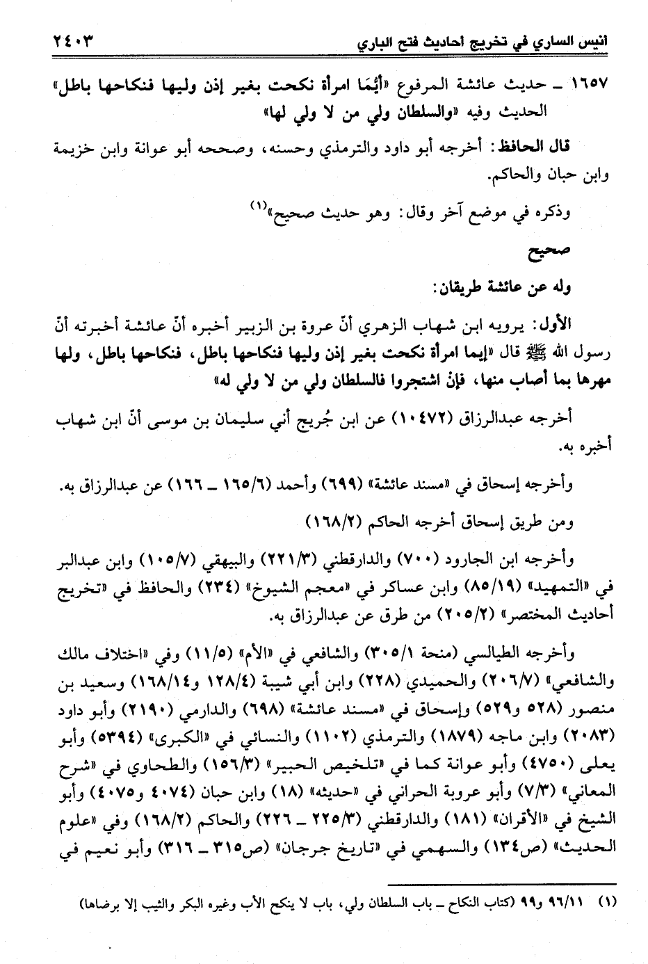 1657 - حديث عائشة المرفوع "أيُّمَا امرأة نكحت بغير إذن وليها فنكاحها باطل" الحديث وفيه "والسلطان ولي من لا ولي لها"
