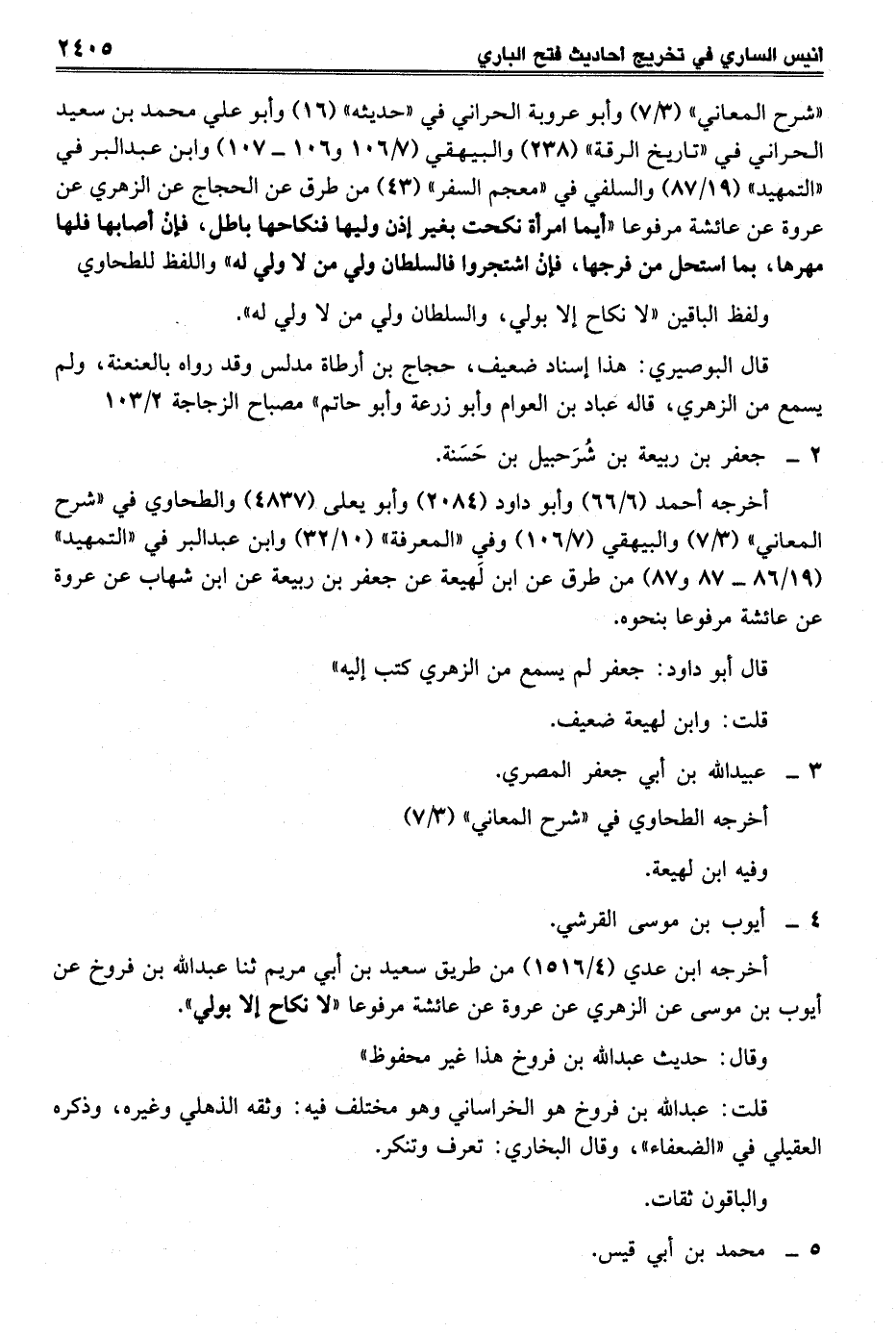"شرح المعاني" (3/ 7) وأبو عروبة الحراني في "حديثه" (16) وأبو علي محمد بن سعيد الحراني في "تاريخ الرقة" (238) والبيهقي (7/ 106و 106 - 107) وابن عبد البر في "التمهيد" (19/ 87) والسلفي في "معجم السفر" (43) من طرق عن الحجاج عن الزهري عن عروة عن عائشة مرفوعا "أيما امرأة نكحت بغير إذن وليها فنكاحها باطل، فإنّ أصابها فلها مهرها، بما استحل من فرجها، فإنْ اشتجروا فالسلطان ولي من لا ولي له" واللفظ للطحاوي
