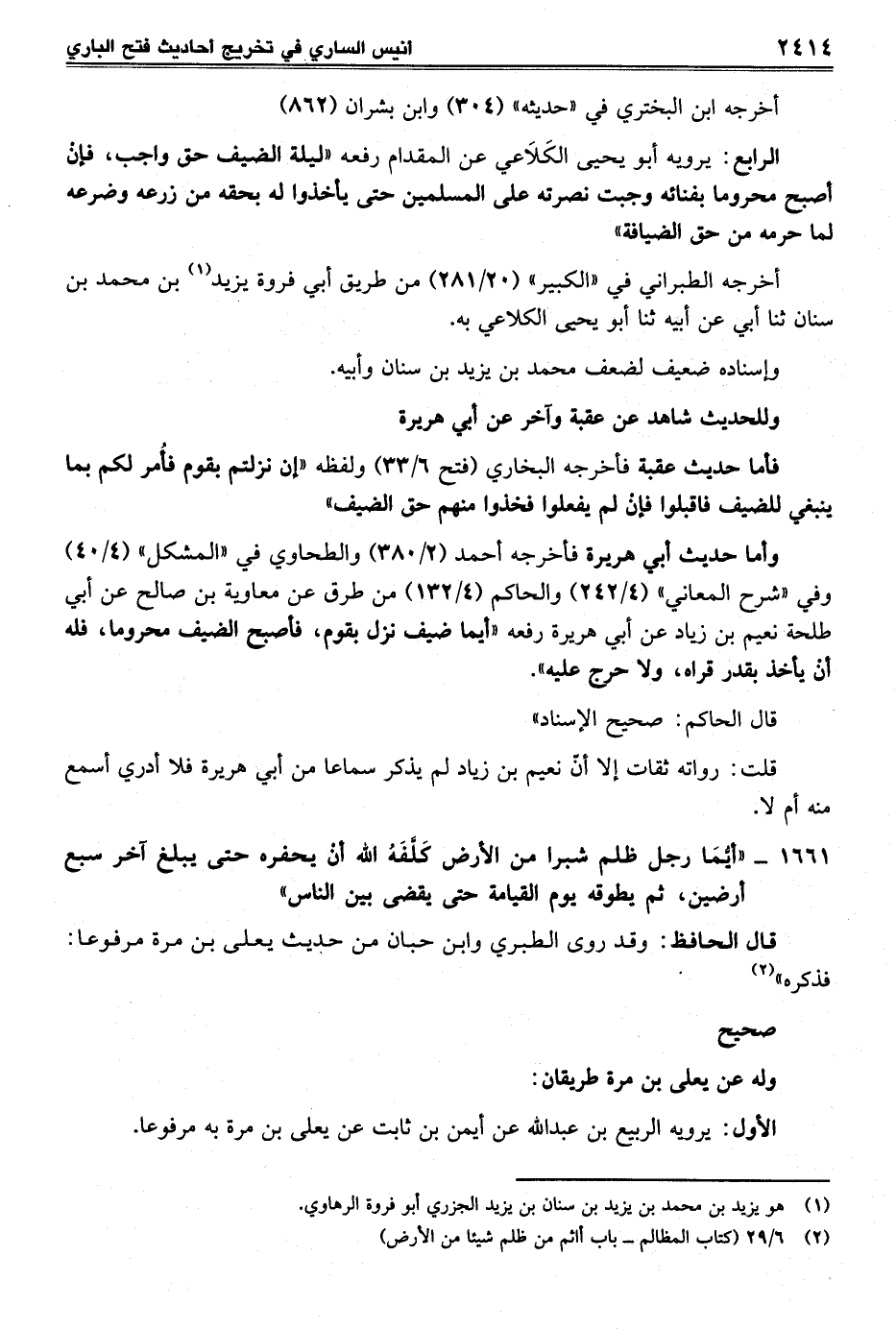 وأما حديث أبي هريرة فأخرجه أحمد (2/ 380) والطحاوي في "المشكل" (4/ 40) وفي "شرح المعاني" (4/ 242) والحاكم (4/ 132) من طرق عن معاوية بن صالح عن أبي طلحة نعيم بن زياد عن أبي هريرة رفعه "أيما ضيف نزل بقوم، فأصبح الضيف محروما، فله أنْ يأخذ بقدر قراه، ولا حرج عليه".