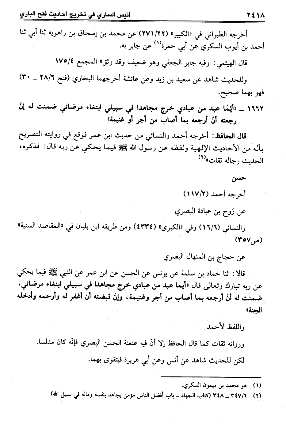 1662 - "أيَّمُا عبد من عبادي خرج مجاهدا في سبيلي ابتغاء مرضاتي ضمنت له إنْ رجعته أنْ أرجعه بما أصاب من أجر أو غنيمة"