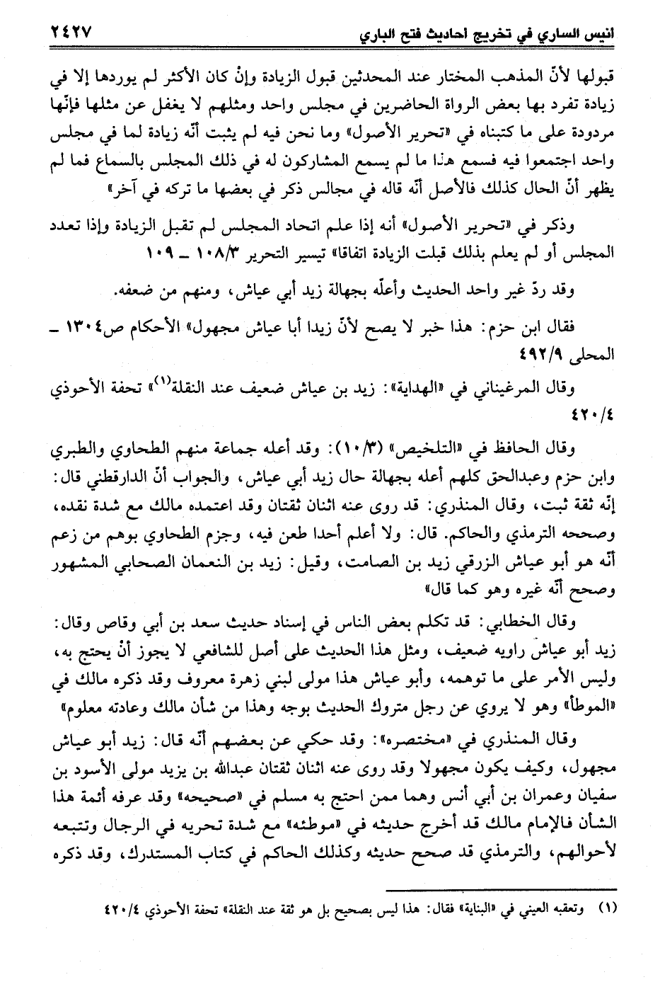 وقال الحافظ في "التلخيص" (3/ 10): وقد أعله جماعة منهم الطحاوي والطبري وابن حزم وعبد الحق كلهم أعله بجهالة حال زيد أبي عياش، والجواب أنّ الدارقطني قال: إنّه ثقة ثبت، وقال المنذري: قد روى عنه اثنان ثقتان وقد اعتمده مالك مع شدة نقده، وصححه الترمذي والحاكم. قال: ولا أعلم أحدا طعن فيه، وجزم الطحاوي بوهم من زعم أنّه هو أبو عياش الزرقي زيد بن الصامت، وقيل: زيد بن النعمان الصحابي المشهور وصحح أنّه غيره وهو كما قال"