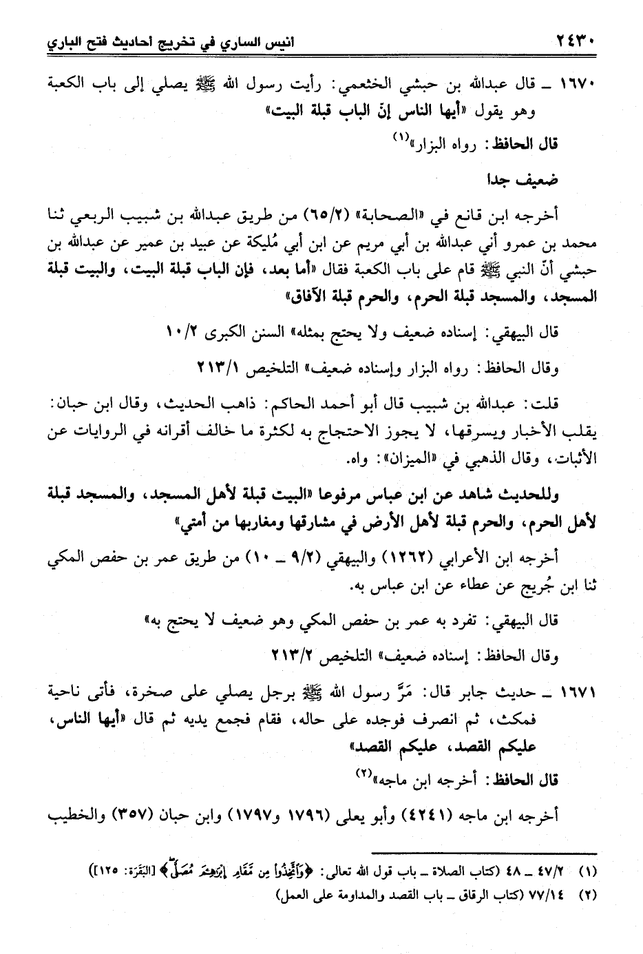1670 - قال عبد الله بن حبشي الخثعمي: رأيت رسول الله - صلى الله عليه وسلم - يصلي إلى باب الكعبة وهو يقول "أيها الناس إنّ الباب قبلة البيت"