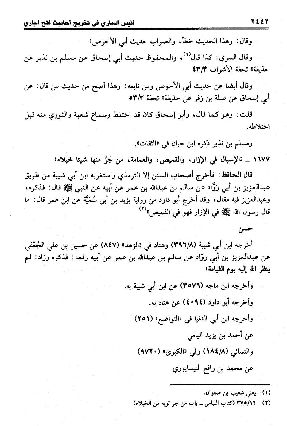 1677 - "الإسبال في الإزار، والقميص، والعمامة، من جَرَّ منها شيئا خيلاء"