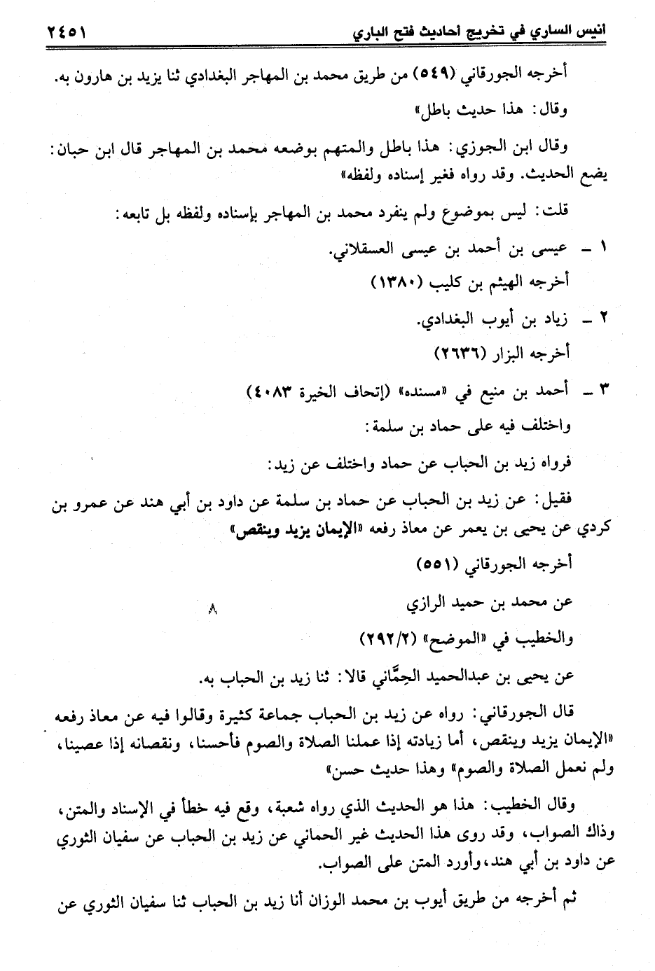 قال الجورقاني: رواه عن زيد بن الحباب جماعة كثيرة وقالوا فيه عن معاذ رفعه "الإيمان يزيد وينقص، أما زيادته إذا عملنا الصلاة والصوم فأحسنا، ونقصانه إذا عصينا، ولم نعمل الصلاة والصوم" وهذا حديث حسن"