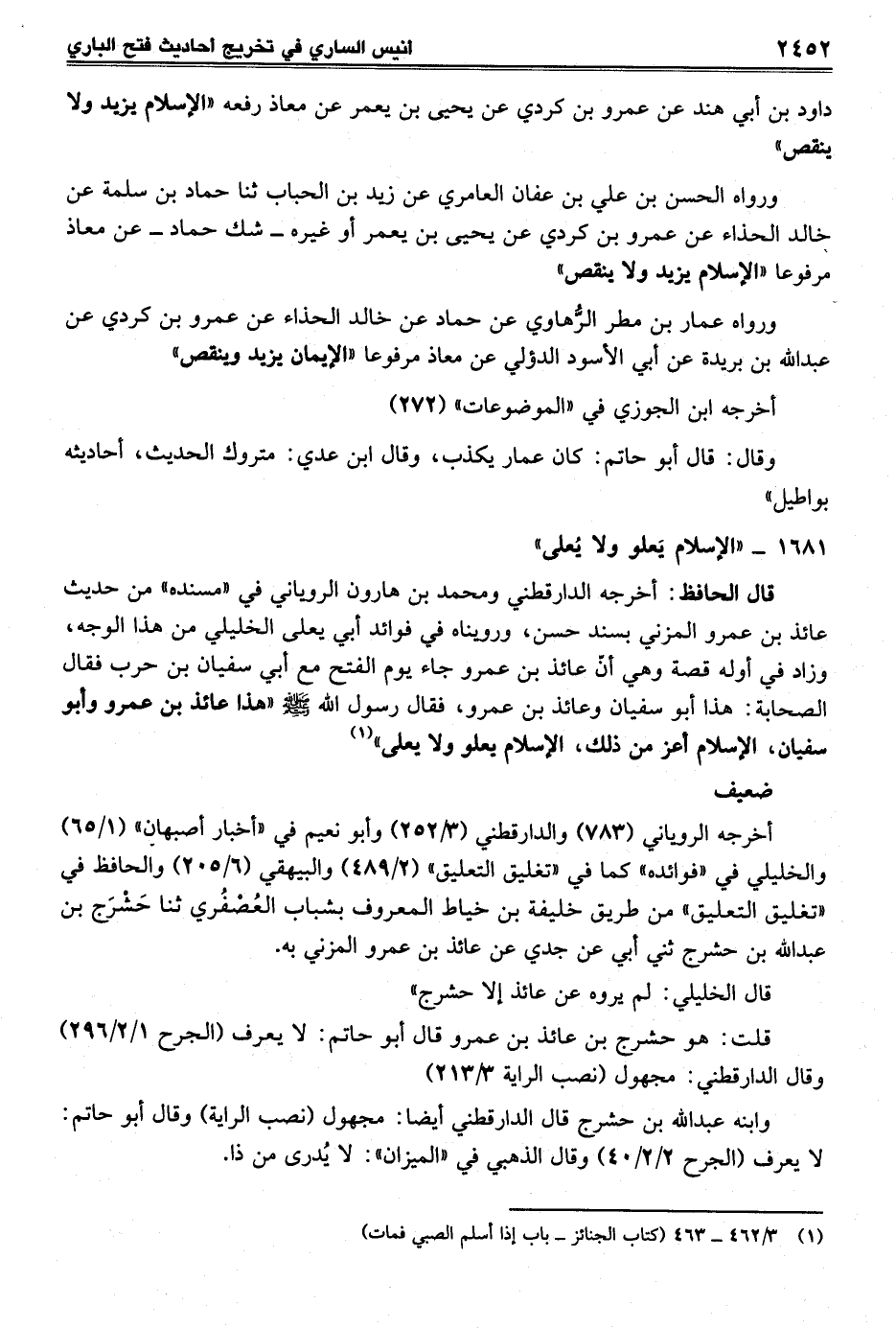 ورواه الحسن بن علي بن عفان العامري عن زيد بن الحباب ثنا حماد بن سلمة عن خالد الحذاء عن عمرو بن كردي عن يحيى بن يعمر أو غيره- شك حماد- عن معاذ مرفوعا "الإسلام يزيد ولا ينقص"