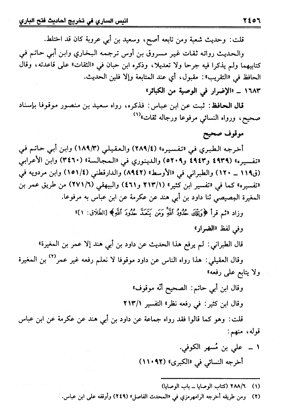 قال الحافظ: ثبت عن ابن عباس: فذكره، رواه سعيد بن منصور موقوفاً بإسناد صحيح، ورواه النسائي مرفوعاً ورجاله ثقات" (¬1)