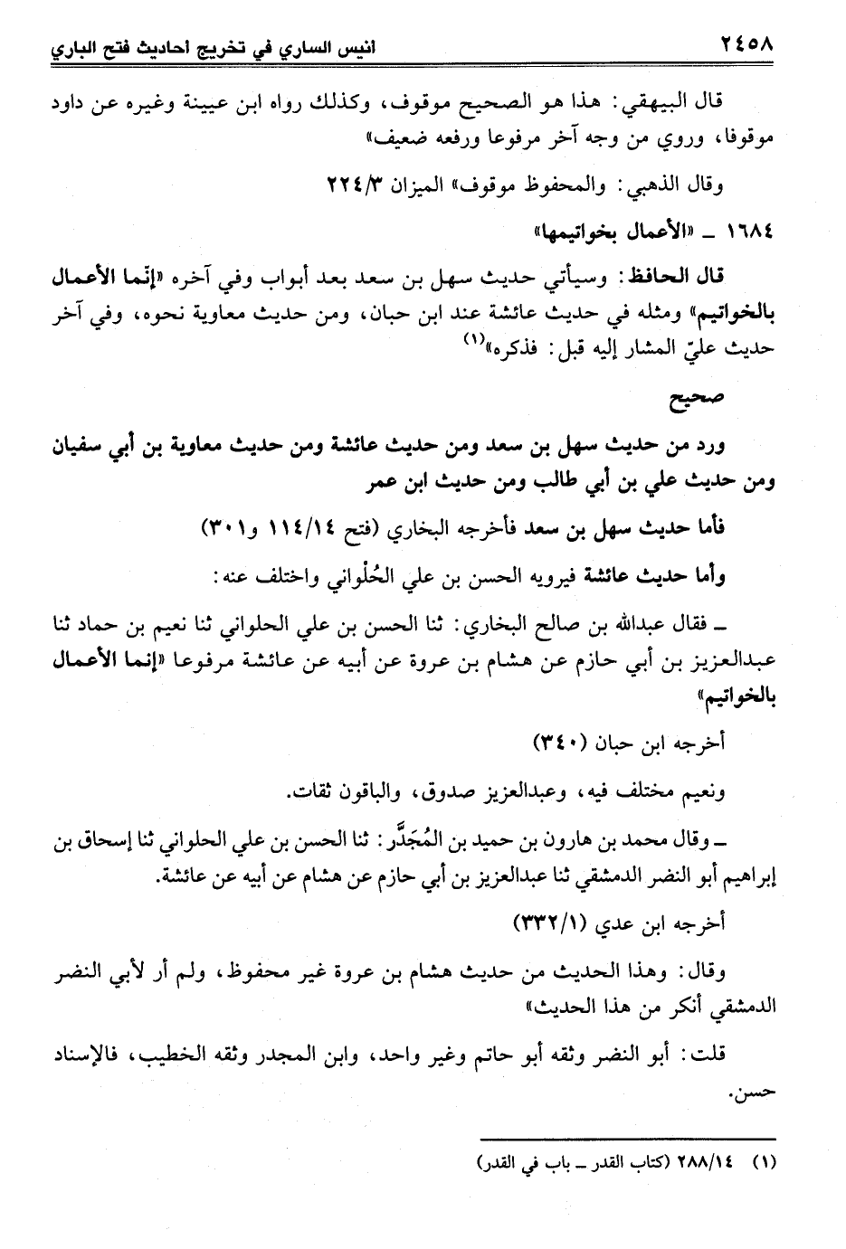 - فقال عبد الله بن صالح البخاري: ثنا الحسن بن علي الحلواني ثنا نعيم بن حماد ثنا عبد العزيز بن أبي حازم عن هشام بن عروة عن أبيه عن عائشة مرفوعاً "إنما الأعمال بالخواتيم"