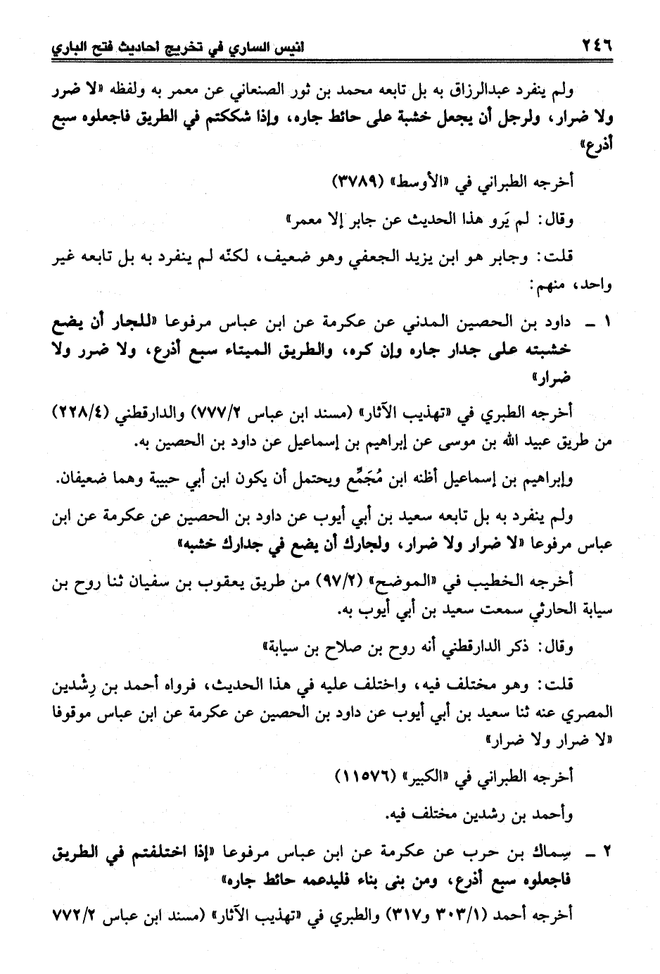 1 - داود بن الحصين المدني عن عكرمة عن ابن عباس مرفوعا "للجار أن يضع خشبته على جدار جاره وإن كره، والطريق الميتاء سبع أذرع، ولا ضرر ولا ضرار"