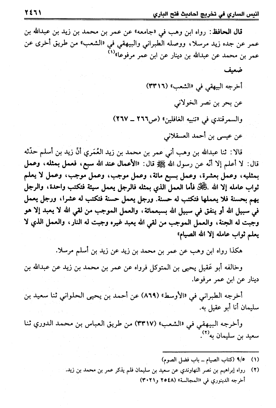 قالا: ثنا عبد الله بن وهب أني عمر بن محمد بن زيد العُمَري أن زيد بن أسلم حدّثه قال: لا أعلم إلا أنّه عن رسول الله - صلى الله عليه وسلم - قال: "الأعمال عند الله سبع، فعمل بمثله، وعمل بمثليه، وعمل بعشرة، وعمل بسبع مائة، وعمل موجب، وعمل موجب، وعمل لا يعلم ثواب عامله إلا الله عز وجل فأما العمل الذي بمثله فالرجل يعمل سيئة فتكتب واحدة، والرجل يهم بحسنة فلا يعملها فتكتب له حسنة. ورجل يعمل حسنة فتكتب له عشرا، ورجل يعمل في سبيل الله أو ينفق في سبيل الله بسبعمائة، والعمل الموجب من لقي الله لا يعبد إلا هو وجبت له الجنة، والعمل الموجب من لقي الله يعبد غيره وجبت له النار، والعمل الذي لا يعلم ثواب عامله إلا الله الصيام"