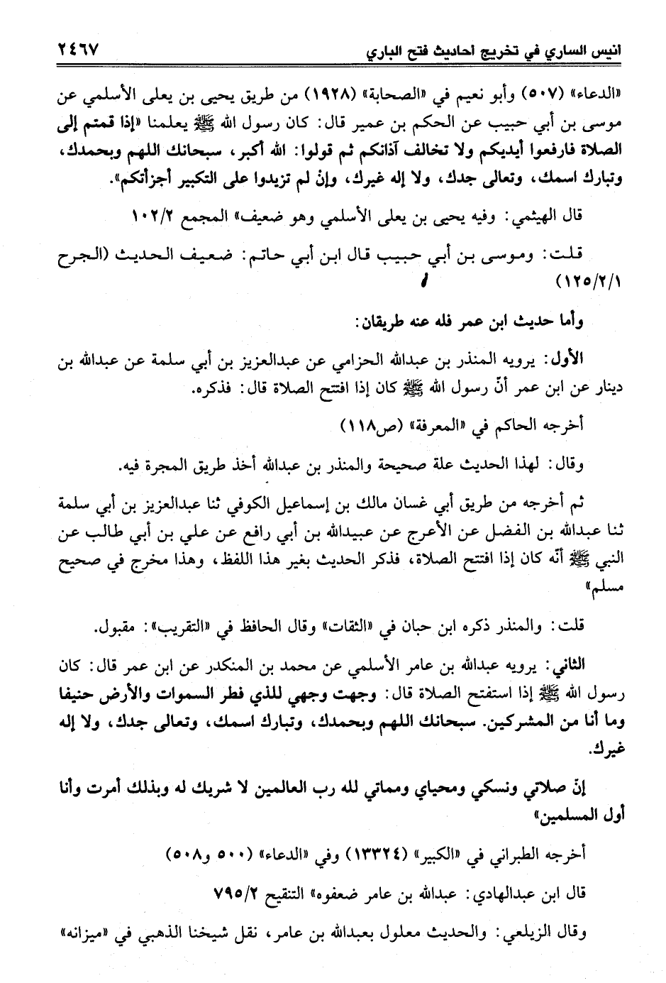 الثاني: يرويه عبد الله بن عامر الأسلمي عن محمد بن المنكدر عن ابن عمر قال: كان رسول الله - صلى الله عليه وسلم - إذا استفتح الصلاة قال: وجهت وجهي للذي فطر السموات والأرض حنيفا وما أنا من المشركين. سبحانك اللهم وبحمدك، وتبارك اسمك، وتعالى جدك، ولا إله غيرك.