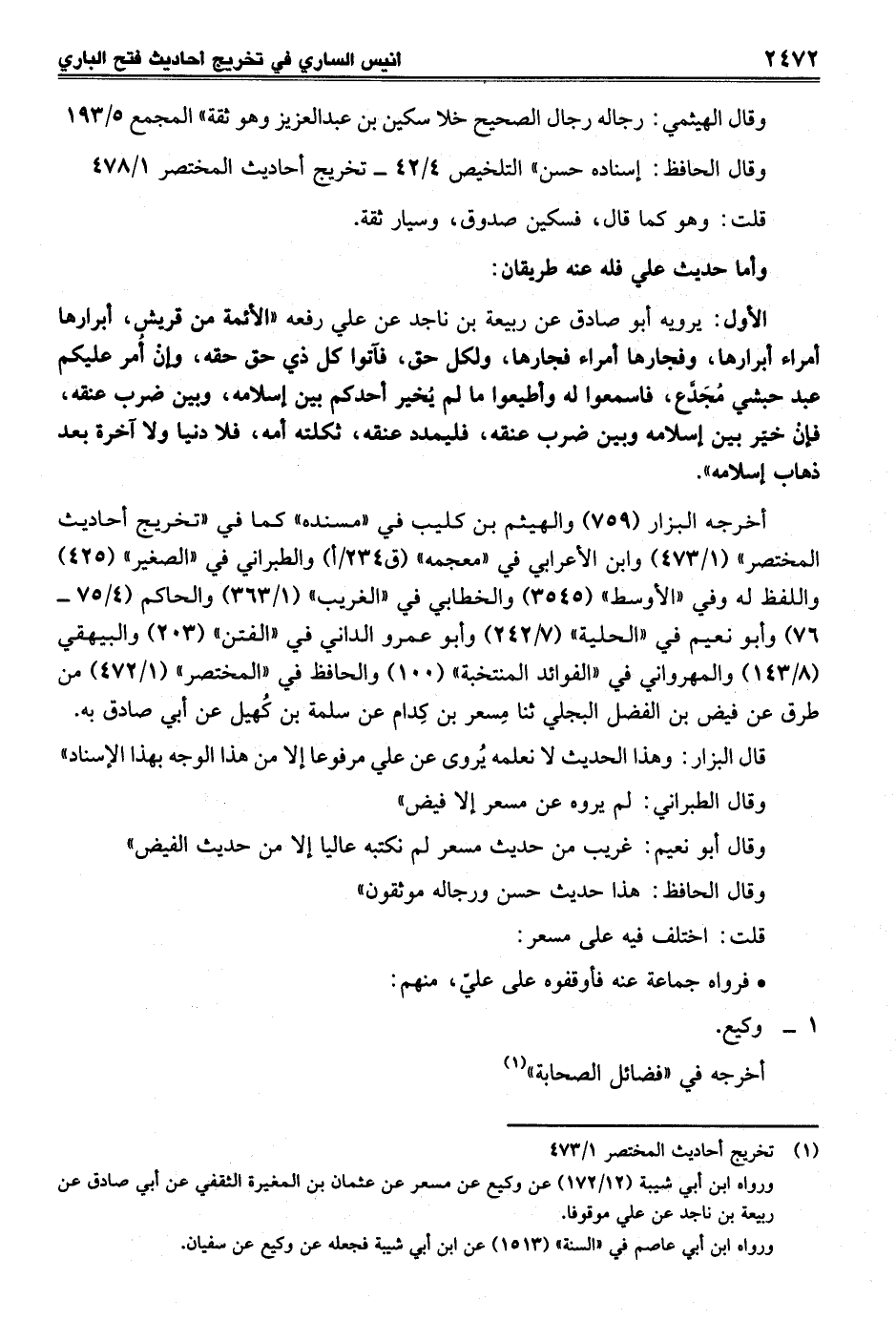 الأول: يرويه أبو صادق عن ربيعة بن ناجد عن علي رفعه "الأئمة من قريش، أبرارها أمراء أبرارها، وفجارها أمراء فجارها, ولكل حق، فآتوا كل ذي حق حقه، وإنْ أُمر عليكم عبد حبشي مُجَدَّع، فاسمعوا له وأطيعوا ما لم يُخير أحدكم بين إسلامه، وبين ضرب عنقه، فإنْ خيّر بين إسلامه وبين ضرب عنقه، فليمدد عنقه، ثكلته أمه، فلا دنيا ولا آخرة بعد ذهاب إسلامه".
