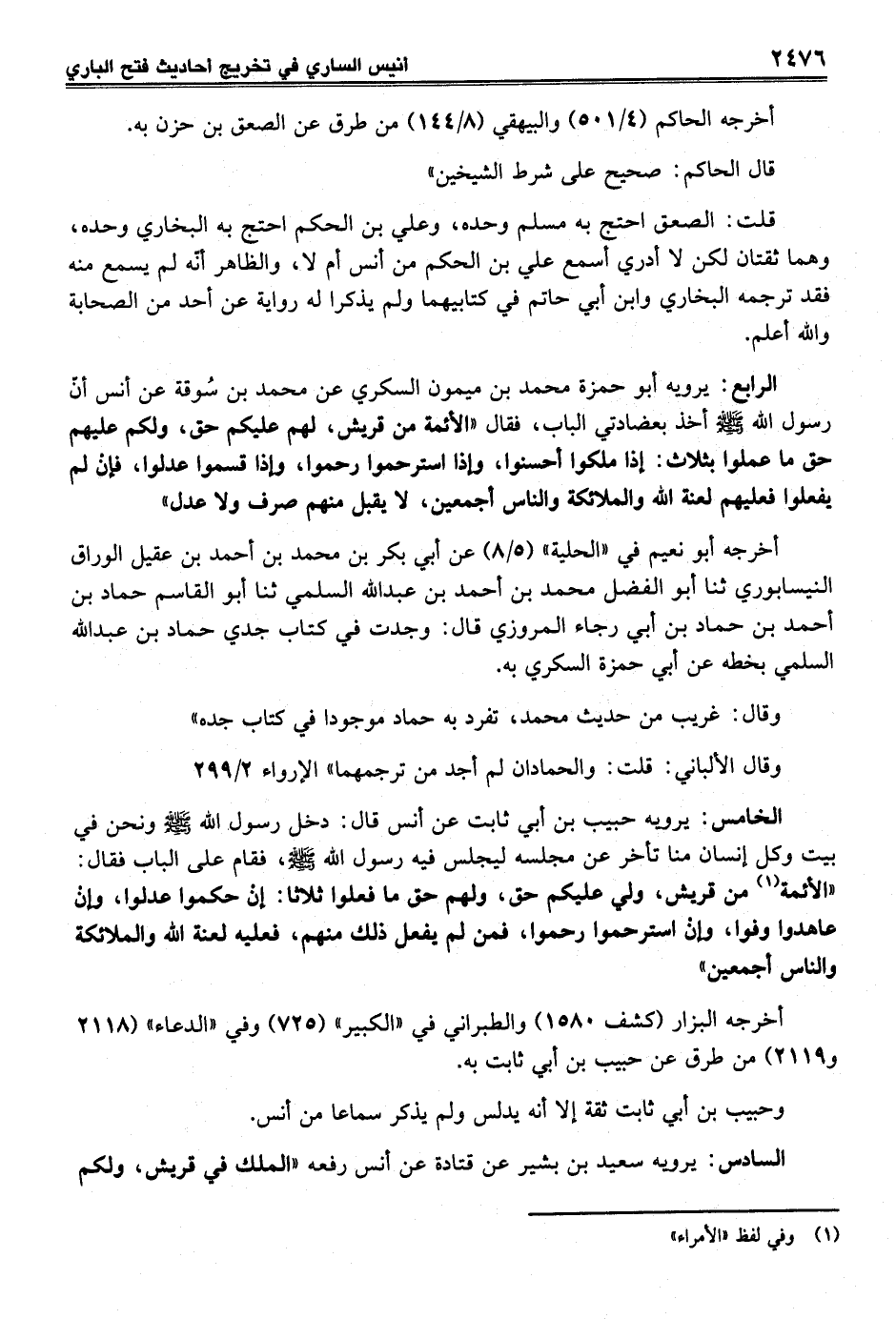 الرابع: يرويه أبو حمزة محمد بن ميمون السكري عن محمد بن سُوقة عن أنس أنّ رسول الله - صلى الله عليه وسلم - أخذ بعضادتي الباب، فقال "الأئمة من قريش، لهم عليكم حق، ولكم عليهم حق ما عملوا بثلاث: إذا ملكوا أحسنوا، وإذا استرحموا رحموا، وإذا قسموا عدلوا، فإنْ لم يفعلوا فعليهم لعنة الله والملائكة والناس أجمعين، لا يقبل منهم صرف ولا عدل"