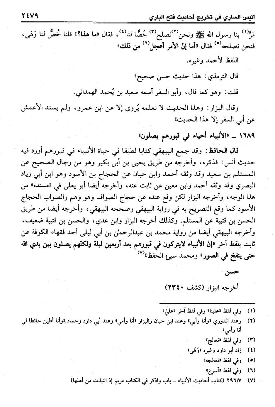 قال الحافظ: وقد جمع البيهقي كتابا لطيفا في حياة الأنبياء في قبورهم أورد فيه حديث أنس: فذكره، وأخرجه من طريق يحيى بن أبي بكير وهو من رجال الصحيح عن المستلم بن سعيد وقد وثقه أحمد وابن حبان عن الحجاج بن الأسود وهو ابن أبي زياد البصري وقد وثقه أحمد وابن معين عن ثابت عنه، وأخرجه أيضاً أبو يعلى في "مسنده" من هذا الوجه، وأخرجه البزار لكن وقع عنده عن حجاج الصواف وهو وهم والصواب الحجاج الأسود كما وقع التصريح به في رواية البيهقي وصححه البيهقي، وأخرجه أيضاً من طريق الحسن بن قتيبة عن المستلم. وكذلك أخرجه البزار وابن عدي، والحسن بن قتيبة ضعيف، وأخرجه البيهقي أيضاً من رواية محمد بن عبد الرحمن بن أبي ليلى أحد فقهاء الكوفة عن ثابت بلفظ آخر "إنّ الأنبياء لا يتركون في قبورهم بعد أربعين ليلة ولكنّهم يصلون بين يدي الله حتى ينفخ في الصور" ومحمد سيئ الحفظ" (¬7)