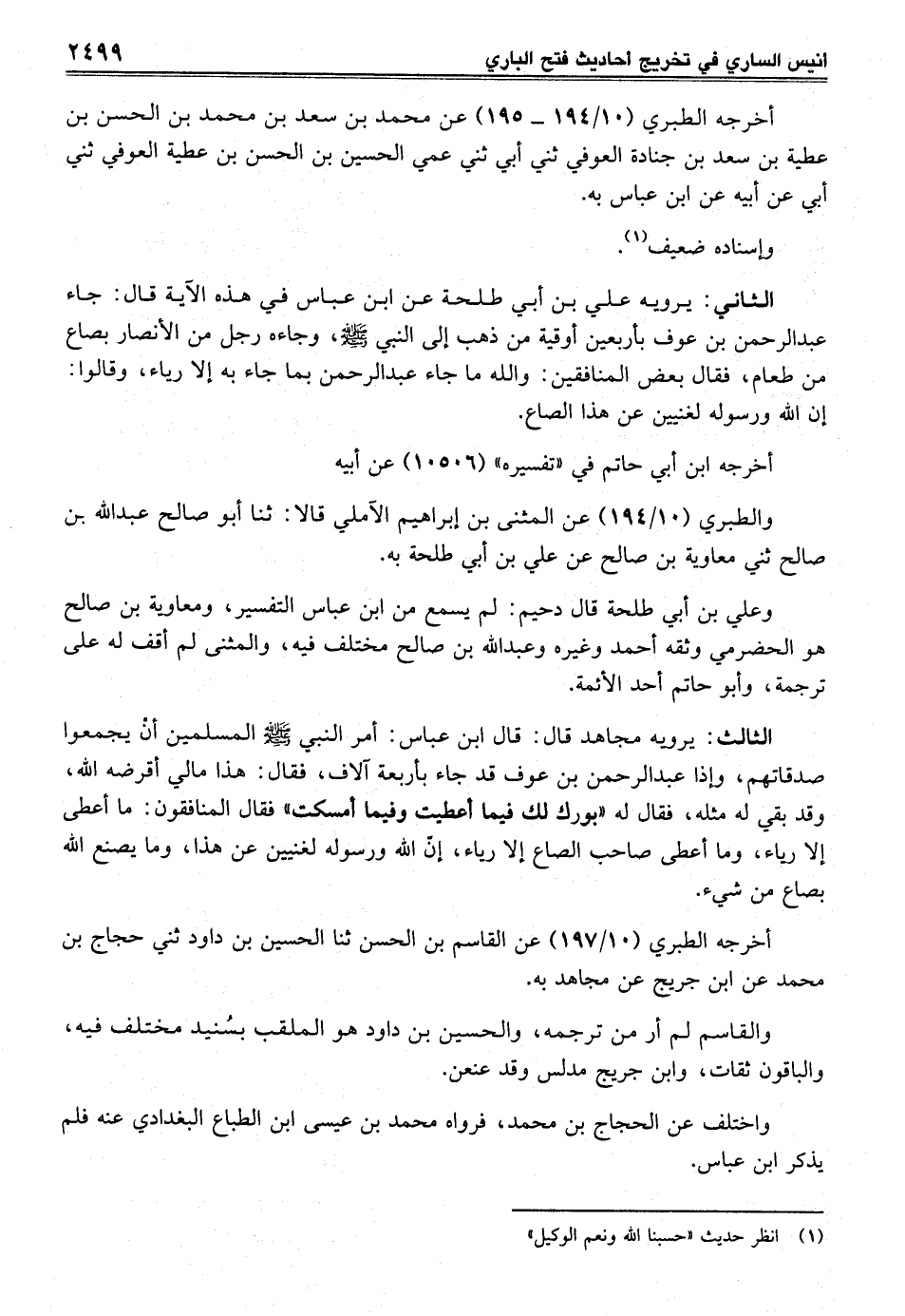 الثالث: يرويه مجاهد قال: قال ابن عباس: أمر النبي - صلى الله عليه وسلم - "المسلمين أنْ يجمعوا صدقاتهم، وإذا عبد الرحمن بن عوف قد جاء بأربعة آلاف، فقال: هذا مالي أقرضه الله، وقد بقي له مثله، فقال له "بورك لك فيما أعطيت وفيما أمسكت" فقال المنافقون: ما أعطى إلا رياء، وما أعطى صاحب الصاع إلا رياء، إن الله ورسوله لغنيين عن هذا، وما يصنع الله بصاع من شيء.