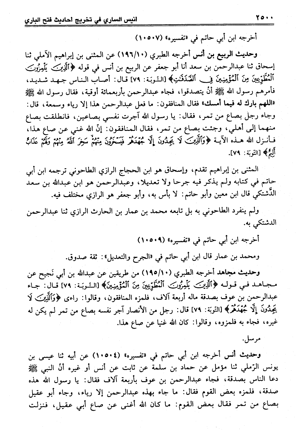 وحديث الربيع بن أنس أخرجه الطبري (10/ 196) عن المثنى بن إبراهيم الآملي ثنا إسحاق ثنا عبد الرحمن بن سعد أنا أبو جعفر عن الربيع بن أنس في قوله {الَّذِينَ يَلْمِزُونَ الْمُطَّوِّعِينَ مِنَ الْمُؤْمِنِينَ فِي الصَّدَقَاتِ} [التوبة: 79] قال: أصاب الناس جهد شديد، فأمرهم رسول الله -صلى الله عليه وسلم - أنْ يتصدقوا، فجاء عبد الرحمن بأربعمائة أوقية، فقال رسول الله - صلى الله عليه وسلم - "اللهم بارك له فيما أمسك" فقال المنافقون: ما فعل عبد الرحمن هذا إلا رياء وسمعة، قال: وجاء رجل بصاع من تمر، فقال: يا رسول الله آجرت نفسي بصاعين، فانطلقت بصاع منهما إلى أهلي، وجئت بصاع من تمر، فقال المنافقون: إنْ الله غني عن صاع هذا، فأنزل الله هذه الآية {وَالَّذِينَ لَا يَجِدُونَ إِلَّا جُهْدَهُمْ فَيَسْخَرُونَ مِنْهُمْ سَخِرَ اللَّهُ مِنْهُمْ وَلَهُمْ عَذَابٌ أَلِيمٌ} [التوبة: 79].