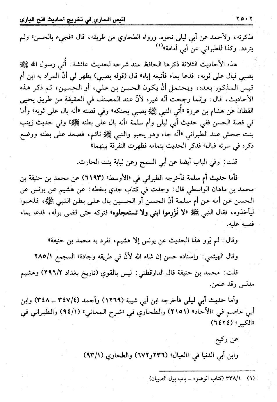 هذه الأحاديث الثلاثة ذكرها الحافظ عند شرحه لحديث عائشة: أُتي رسول الله - صلى الله عليه وسلم - بصبي فبال على ثوبه، فدعا بماء فأتبعه إياه" قال (قوله بصبي) يظهر لي أنّ المراد به ابن أم قيس المذكور بعده، ويحتمل أنْ يكون الحسن بن علي، أو الحسين، ثم ذكر هذه الأحاديث، قال: وإنما رجحت أنّه غيره لأنّ عند المصنف في العقيقة من طريق يحيى القطان عن هشام بن عروة "أُتي النبي - صلى الله عليه وسلم - بصبي يحنكه" وفي قصته "إنه بال على ثوبه" وأما في قصة الحسن ففي حديث أبي ليلى وأم سلمة "أنه بال على بطنه - صلى الله عليه وسلم -" وفي حديث زينب بنت جحش عند الطبراني "أنّه جاء وهو يحبو والنبي - صلى الله عليه وسلم - نائم، فصعد على بطنه ووضع ذكره في سرته فبال" فذكر الحديث بتمامه فظهرت التفرقة بينهما"
