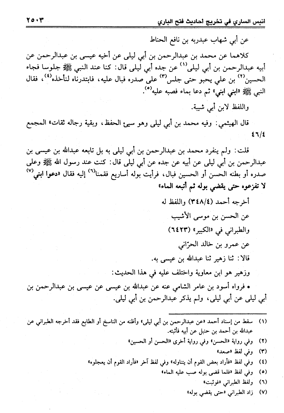 كلاهما عن محمد بن عبد الرحمن بن أبي ليلى عن أخيه عيسى بن عبد الرحمن عن أبيه عبد الرحمن بن أبي ليلى (¬1) عن جده أبي ليلى قال: كنا عند النبي - صلى الله عليه وسلم - جلوسا فجاء الحسين (¬2) بن علي يحبو حتى جلس (¬3) على صدره فبال عليه، فابتدرناه لنأخذه (¬4)، فقال النبي - صلى الله عليه وسلم - "ابني ابني" ثم دعا بماء فصبه عليه (¬5).
