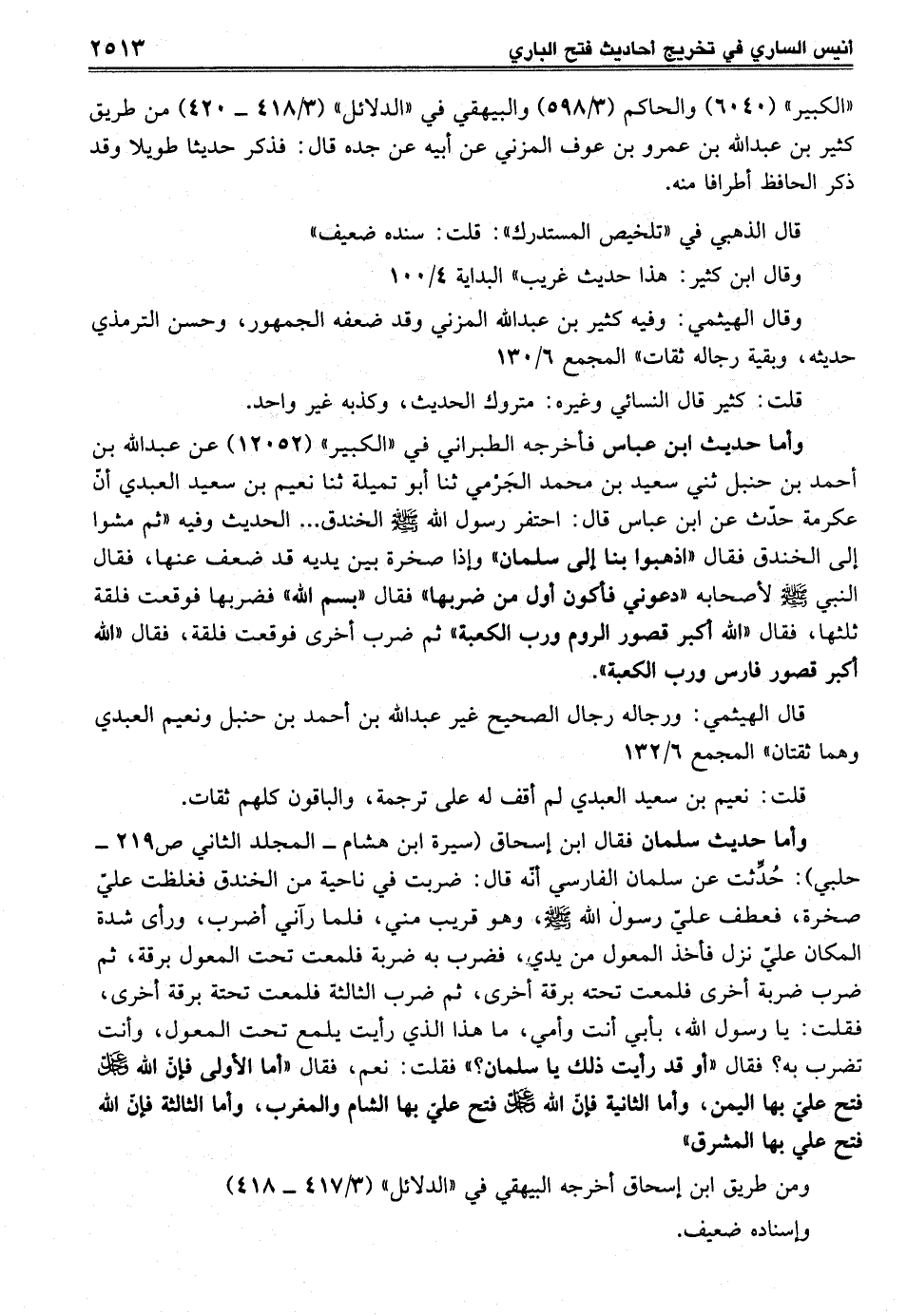 وأما حديث ابن عباس فأخرجه الطبراني في "الكبير" (12052) عن عبد الله بن أحمد بن حنبل ثني سعيد بن محمد الجَرْمي ثنا أبو تميلة ثنا نعيم بن سعيد العبدي أنّ عكرمة حدّث عن ابن عباس قال: احتفر رسول الله - صلى الله عليه وسلم - الخندق ... الحديث وفيه "ثم مشوا إلى الخندق فقال "اذهبوا بنا إلى سلمان" وإذا صخرة بين يديه قد ضعف عنها، فقال النبي - صلى الله عليه وسلم - لأصحابه "دعوني فأكون أول من ضربها" فقال "بسم الله فضربها فوقعت فلقة ثلثها، فقال "الله أكبر قصور الروم ورب الكعبة" ثم ضرب أخرى فوقعت فلقة، فقال "الله أكبر قصور فارس ورب الكعبة".