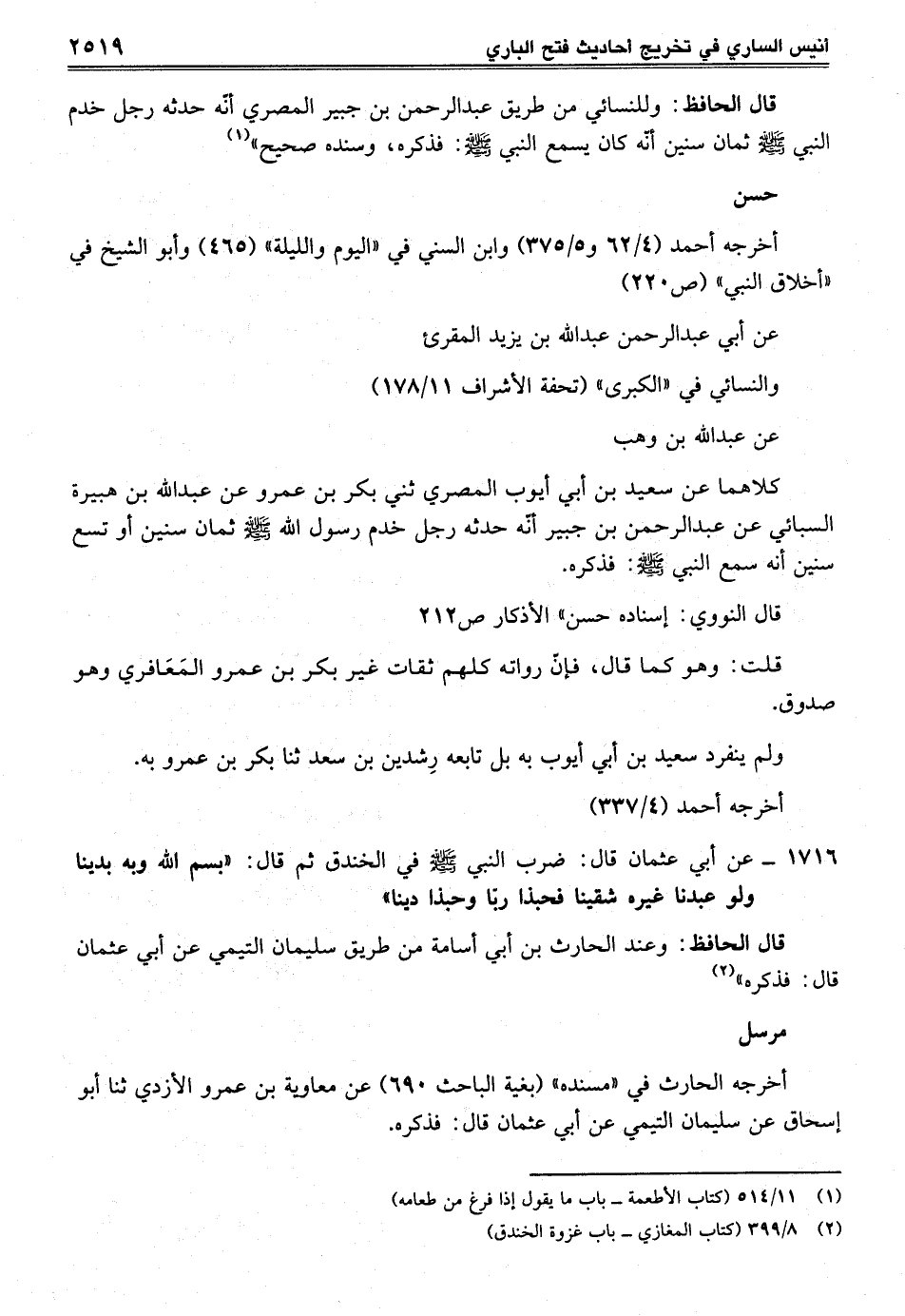 قال الحافظ: وللنسائي من طريق عبد الرحمن بن جبير المصري أنّه حدثه رجل خدم النبي - صلى الله عليه وسلم - ثمان سنين أنّه كان يسمع النبي - صلى الله عليه وسلم -: فذكره، وسنده صحيح" (¬1)