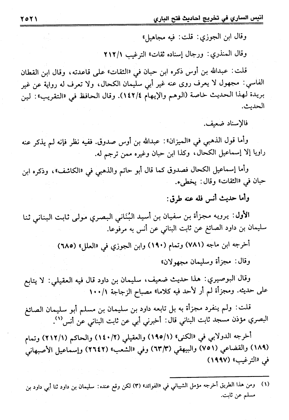 وأما قول الذهبي في "الميزان": عبد الله بن أوس صدوق. ففيه نظر فإنه لم يذكر عنه راويا إلا إسماعيل الكحال، وكذا ابن حبان وغيره ممن ترجم له.