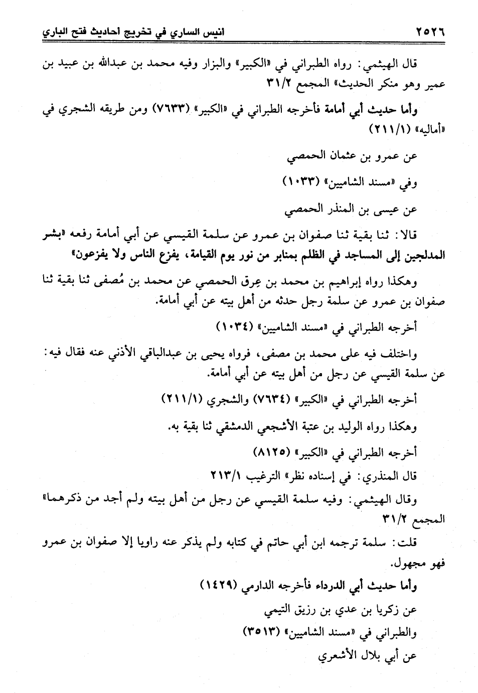 قالا: ثنا بقية ثنا صفوان بن عمرو عن سلمة القيسي عن أبي أمامة رفعه "بشر المدلجين إلى المساجد في الظلم بمنابر من نور يوم القيامة، يفزع الناس ولا يفزعون"