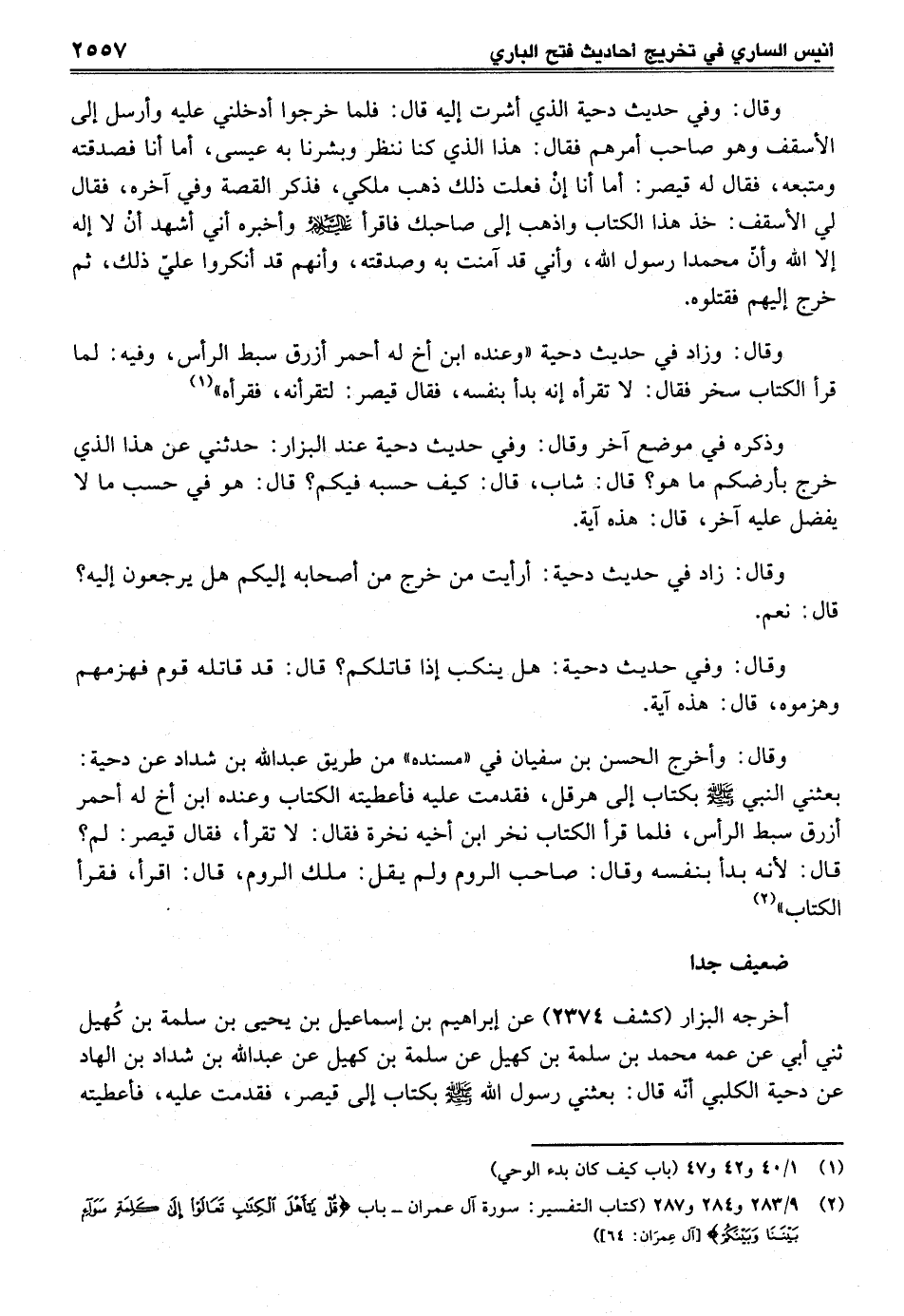 وقال: وزاد في حديث دحية "وعنده ابن أخ له أحمر أزرق سبط الرأس، وفيه: لما قرأ الكتاب سخر فقال: لا تقرأه إنه بدأ بنفسه، فقال قيصر: لتقرأنه، فقرأه" (¬1)