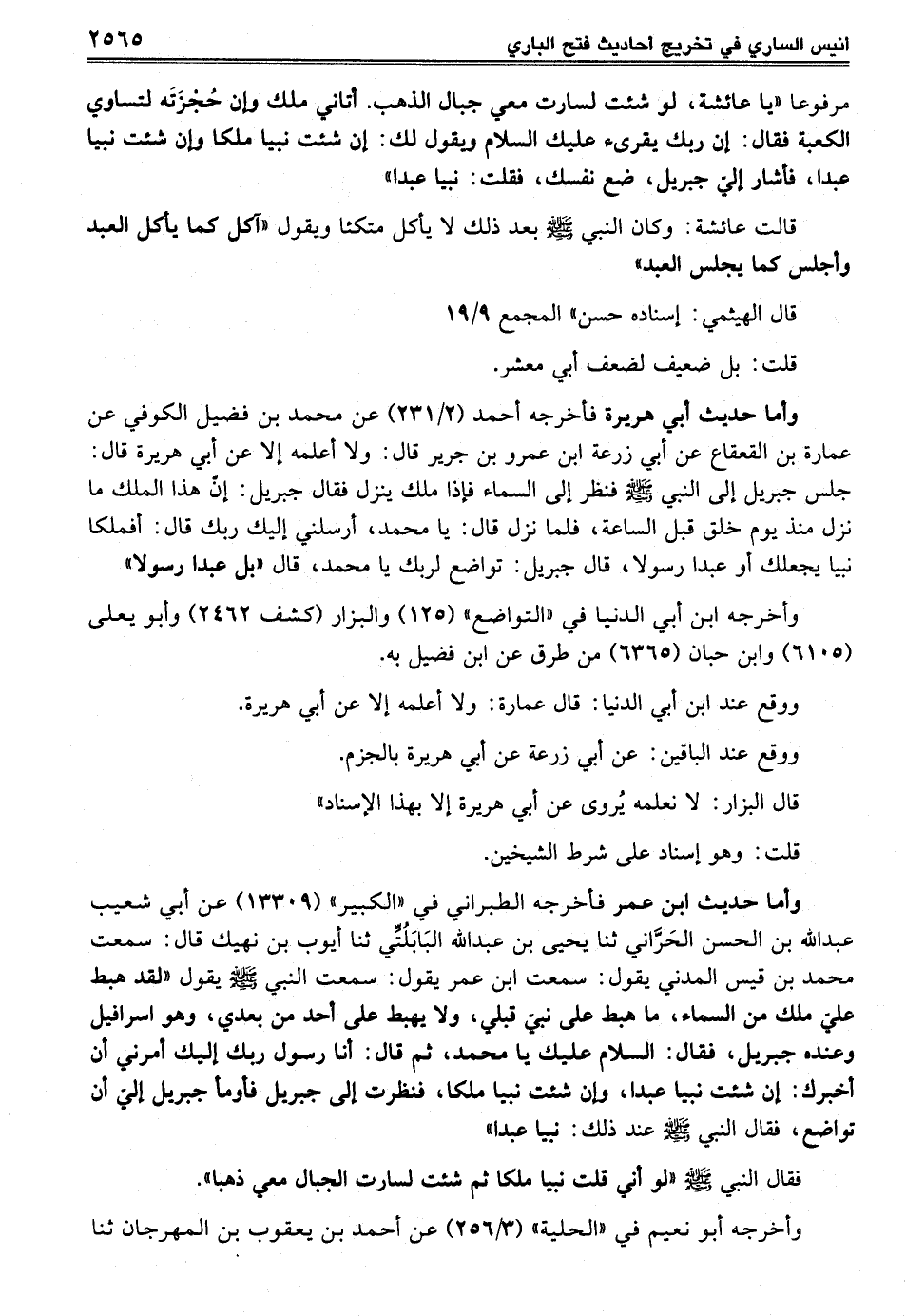 مرفوعاً "يا عائشة، لو شئت لسارت معي جبال الذهب. أتاني ملك وإن حُجزَتَه لتساوي الكعبة فقال: إن ربك يقرىء عليك السلام ويقول لك: إن شئت نبيا ملكا وإن شئت نبيا عبدا، فأشار إلي جبريل، ضع نفسك، فقلت: نبيا عبدا"