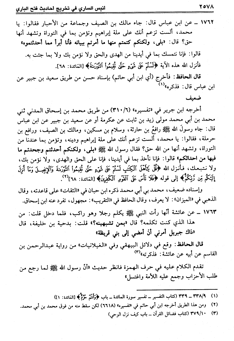 1762 - عن ابن عباس قال: جاء مالك بن الصيف وجماعة من الأحبار فقالوا: يا محمد، ألست تزعم أنك على ملة إبراهيم وتؤمن بما في التوراة وتشهد أنها حق؟ قال: "بلى، ولكنكم كتمتم منها ما أمرتم ببيانه فأنا أبرأ مما أحدثتموه"