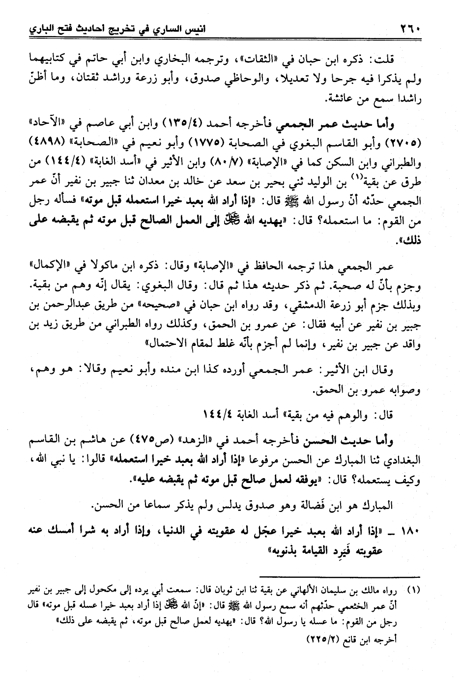 وأما حديث عمر الجمعي فأخرجه أحمد (4/ 135) وابن أبي عاصم في "الآحاد" (2705) وأبو القاسم البغوي في الصحابة (1775) وأبو نعيم في "الصحابة" (4898) والطبراني وابن السكن كما في "الإصابة" (7/ 80) وابن الأثير في "أسد الغابة" (4/ 144) من طرق عن بقية (¬1) بن الوليد ثني بحير بن سعد عن خالد بن معدان ثنا جبير بن نفير أنّ عمر الجمعي حدثه أنّ رسول الله - صلى الله عليه وسلم - قال: "إذا أراد الله بعبد خيرا استعمله قبل موته" فسأله رجل من القوم: ما استعمله؟ قال: "يهديه الله -عز وجل- إلى العمل الصالح قبل موته ثم يقبضه على ذلك".