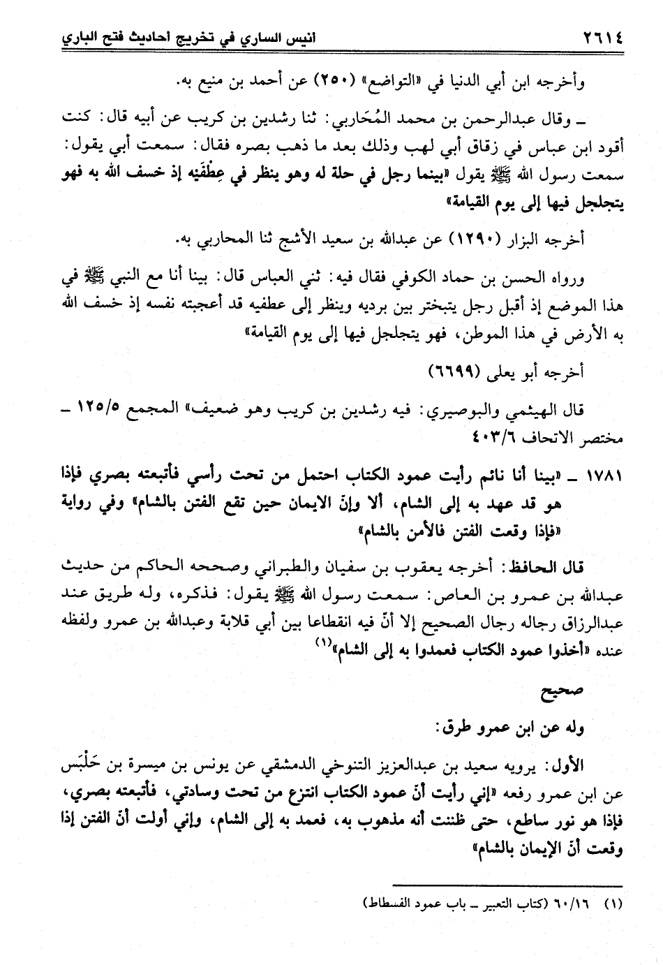 قال الحافظ: أخرجه يعقوب بن سفيان والطبراني وصححه الحاكم من حديث عبد الله بن عمرو بن العاص: سمعت رسول الله - صلى الله عليه وسلم - يقول: فذكره، وله طريق عند عبد الرزاق رجاله رجال الصحيح إلا أنّ فيه انقطاعا بين أبي قلابة وعبد الله بن عمرو ولفظه عنده "أخذوا عمود الكتاب فعمدوا به إلى الشام" (¬1)