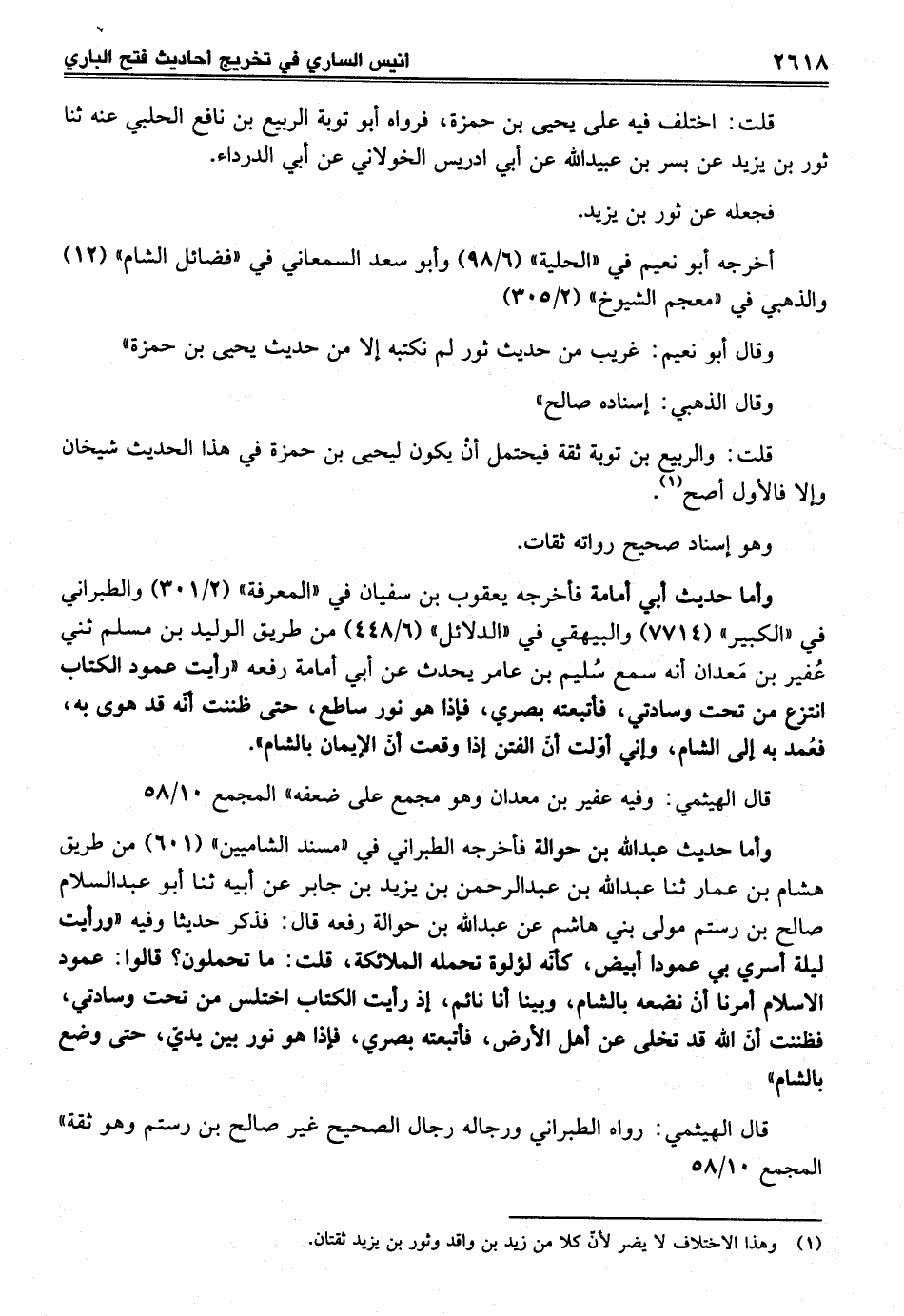 وأما حديث عبد الله بن حوالة فأخرجه الطبراني في "مسند الشاميين" (601) من طريق هشام بن عمار ثنا عبد الله بن عبد الرحمن بن يزيد بن جابر عن أبيه ثنا أبو عبد السلام صالح بن رستم مولى بني هاشم عن عبد الله بن حوالة رفعه قال: فذكر حديثا وفيه "ورأيت ليلة أسري بي عمودا أبيض، كأنّه لؤلوة تحمله الملائكة، قلت: ما تحملون؟ قالوا: عمود الإسلام أمرنا أنْ نضعه بالشام، وبينا أنا نائم، إذ رأيت الكتاب اختلس من تحت وسادتي، فظننت أنّ الله قد تخلى عن أهل الأرض، فأتبعته بصري، فإذا هو نور بين يديّ، حتى وضع بالشام"