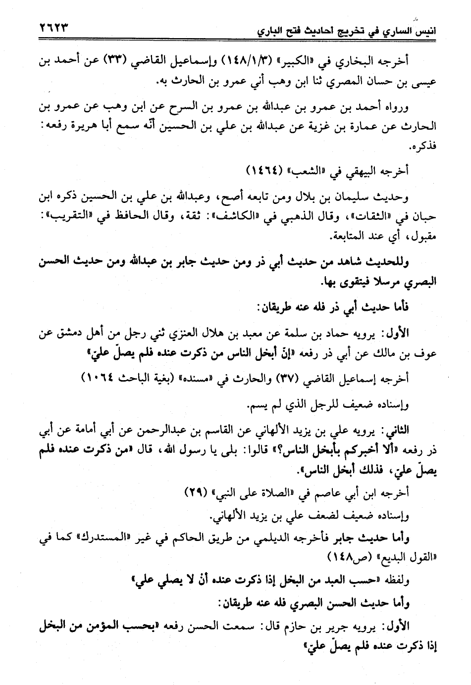 الثاني: يرويه علي بن يزيد الألهاني عن القاسم بن عبد الرحمن عن أبي أمامة عن أبي ذر رفعه "ألا أخبركم بأبخل الناس؟ " قالوا: بلى يا رسول الله، قال "من ذكرت عنده فلم يصلّ عليّ، فذلك أبخل الناس".