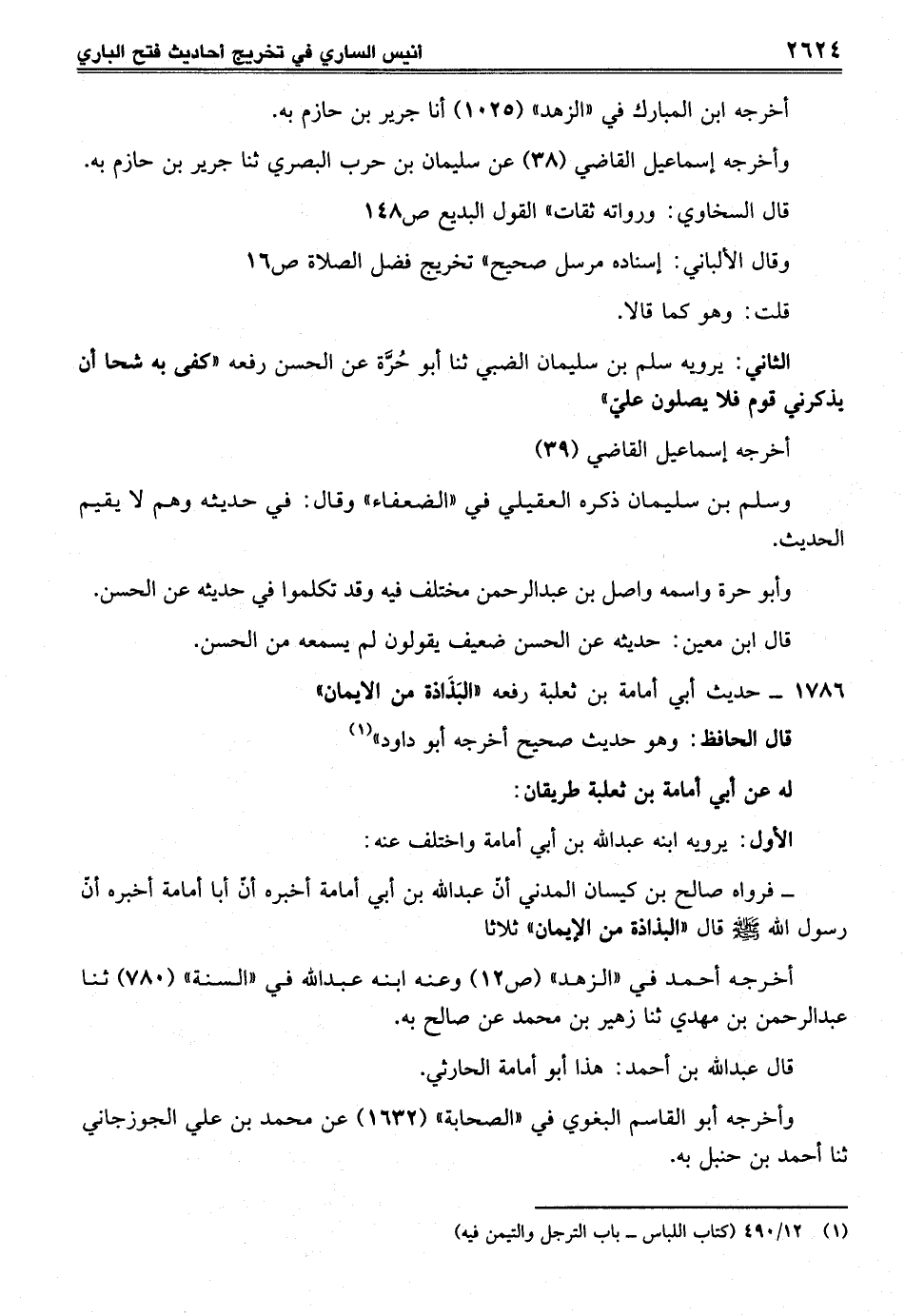 - فرواه صالح بن كيسان المدني أنّ عبد الله بن أبي أمامة أخبره أنّ أبا أمامة أخبره أنّ رسول الله - صلى الله عليه وسلم - قال "البذاذة من الإيمان" ثلاثا