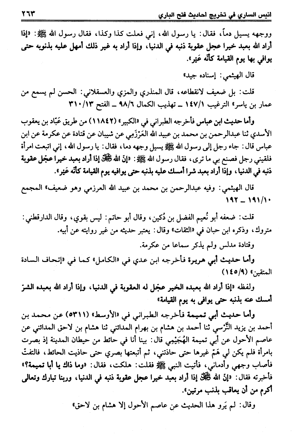 وأما حديث أبي تميمة فأخرجه الطبراني في "الأوسط" (5311) عن محمَّد بن أحمد بن يزيد النَّرسي ثنا أحمد بن هشام بن بهرام المدائني ثنا هشام بن لاحق المدائني عن عاصم الأحول عن أبي تميمة الهُجَيمِي قال: بينا أنا في حائط من حيطان المدينة إذ بصرت بامرأة فلم يكن لي هَمّ غيرها حتى حاذتني، ثم أتبعتها بصري حتى حاذيت الحائط، فالتفتّ فأصاب وجهي وأدماني، فأتيت النبي - صلى الله عليه وسلم - فقلت: هلكت، فقال: "وما ذاك يا أبا تميمة؟ " فأخبرته فقال: "إنّ الله -عز وجل- إذا أراد بعبد خيرا عجل عقوبة ذنبه في الدنيا، وربنا تبارك وتعالى أكرم من أن يعاقب بذنب مرتين".