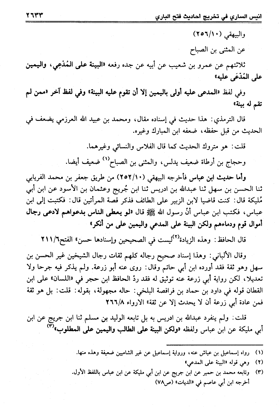 ثلاثتهم عن عمرو بن شعيب عن أبيه عن جده رفعه "لبينة على المُدّعِي، واليمين على المُدّعَى عليه"