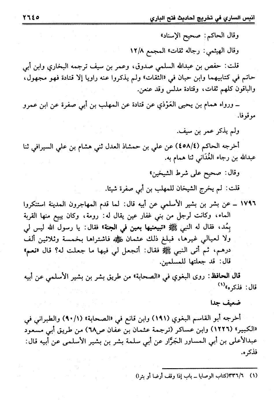 1796 - عن بشر بن بشير الأسلمي عن أبيه قال: لما قدم المهاجرون المدينة استنكروا الماء، وكانت لرجل من بني غفار عين يقال له: رومة، وكان يبيع منها القربة بِمُد، فقال له النبي - صلى الله عليه وسلم - "تبيعنيها بعين في الجنة" فقال: يا رسول الله ليس لي ولا لعيالي غيرها، فبلغ ذلك عثمان - رضي الله عنه - فاشتراها بخمسة وثلاثين ألف درهم، ثم أتى النبي - صلى الله عليه وسلم - فقال: أتجعل لي فيها ما جعلت له؟ قال "نعم" قال: قد جعلتها للمسلمين.