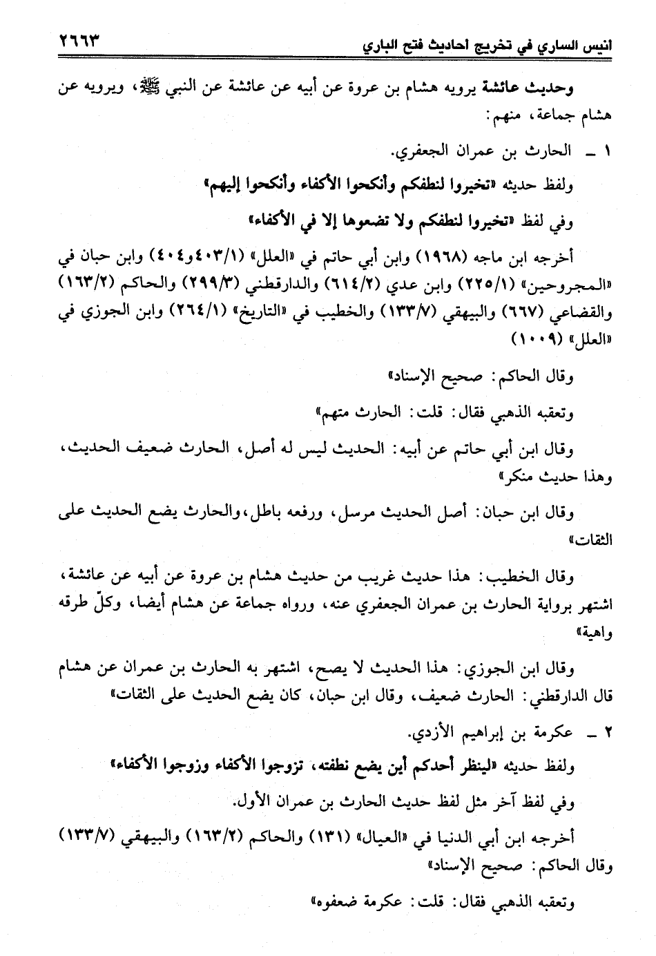 وقال ابن الجوزي: هذا الحديث لا يصح، اشتهر به الحارث بن عمران عن هشام قال الدارقطني: الحارث ضعيف، وقال ابن حبان، كان يضع الحديث على "الثقات"