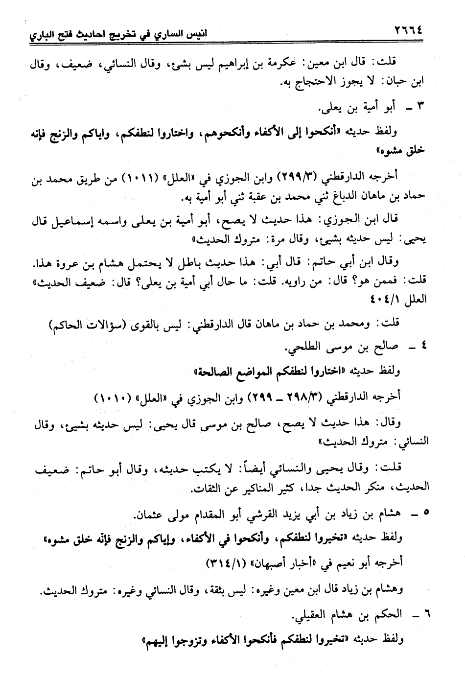 ولفظ حديثه "أنكحوا إلى الأكفاء وأنكحوهم، واختاروا لنطفكم، وإياكم والزنج فإنه خلق مشوه"