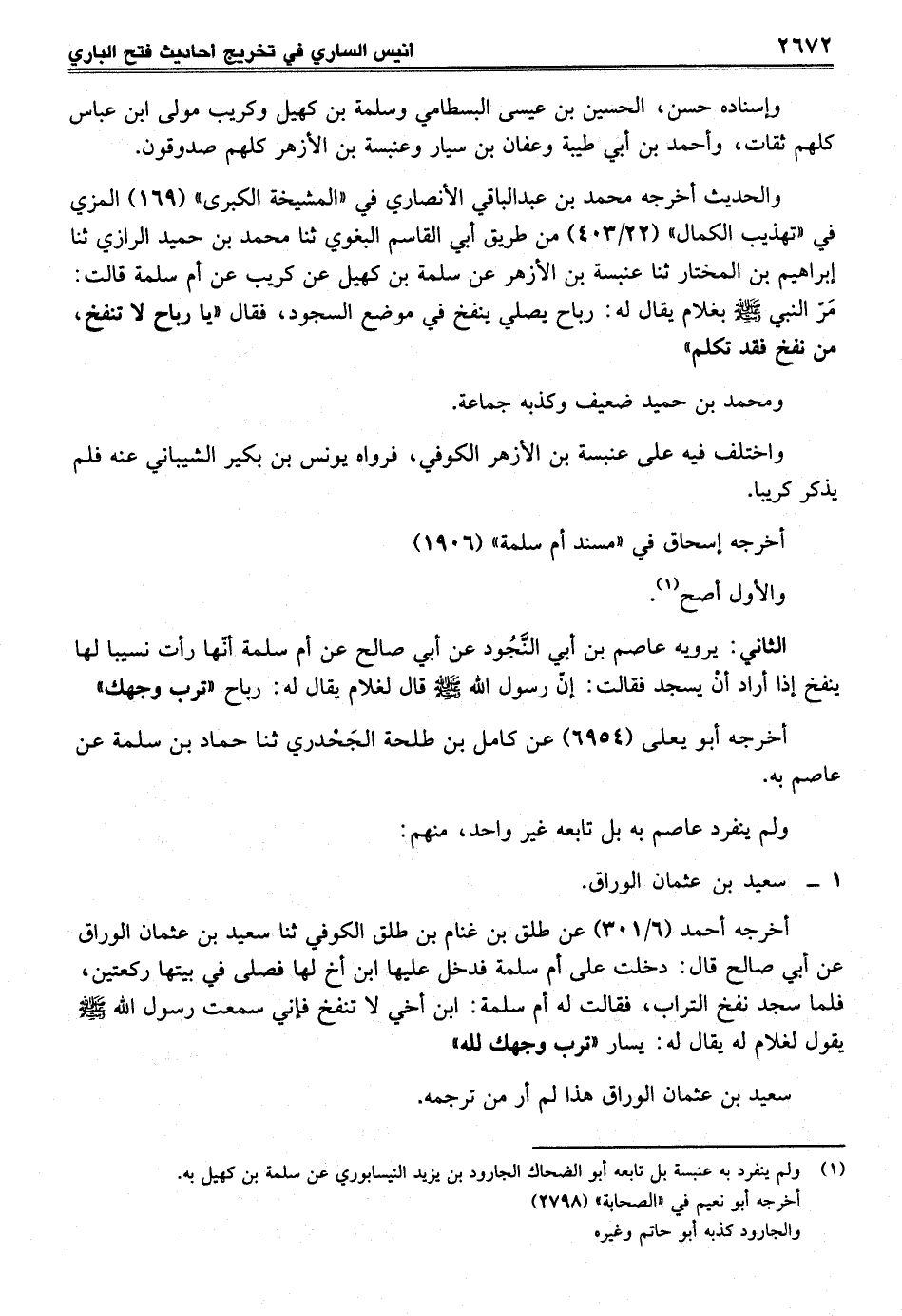 الثاني: يرويه عاصم بن أبي النَّجُود عن أبي صالح عن أم سلمة أنّها رأت نسيبا لها ينفخ إذا أراد أنْ يسجد فقالت: إنّ رسول الله - صلى الله عليه وسلم - قال لغلام يقال له: رباح "ترب وجهك"