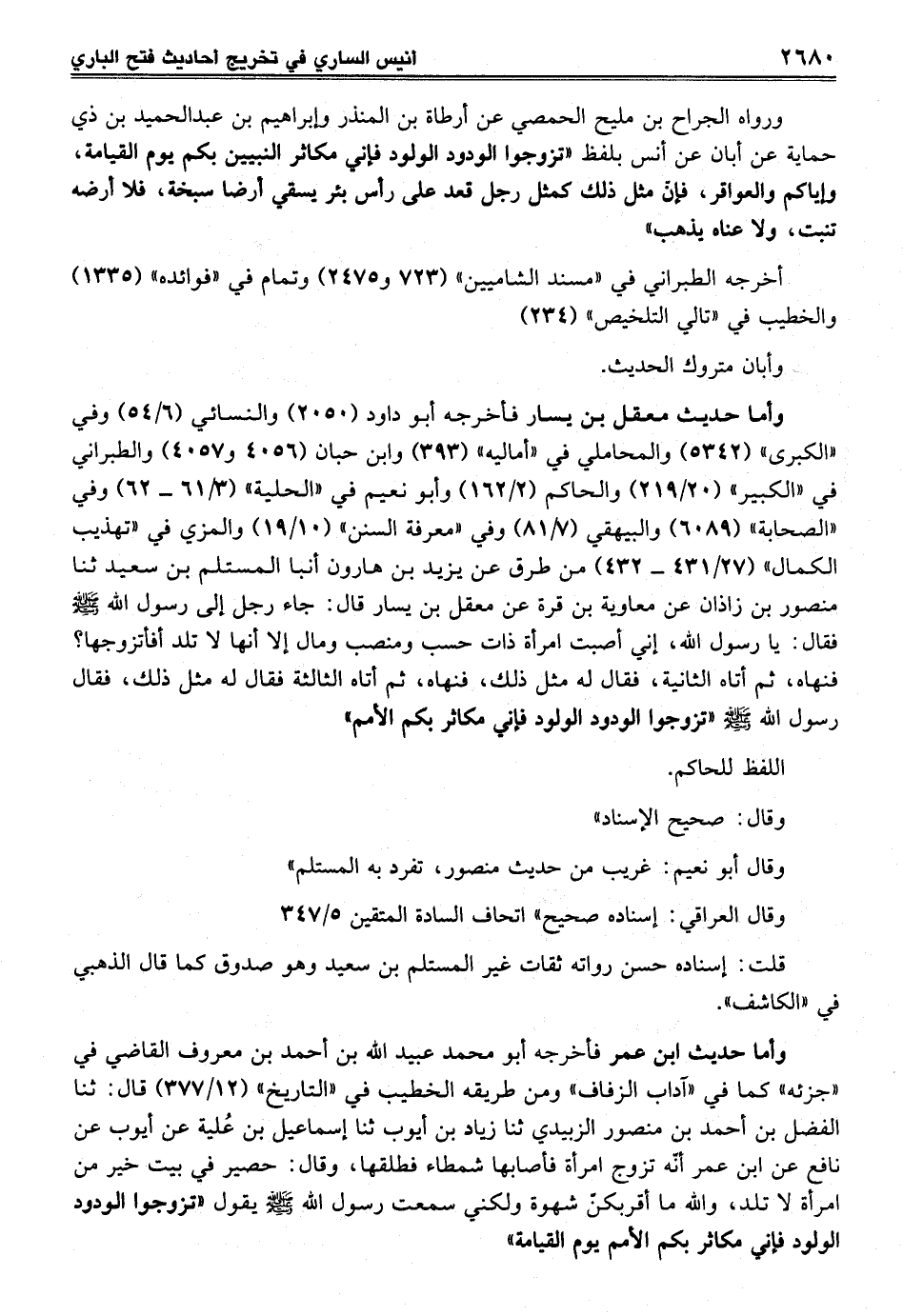 وأما حديث معقل بن يسار فأخرجه أبو داود (2050) والنسائي (6/ 54) وفي "الكبرى" (5342) والمحاملي في "أماليه" (393) وابن حبان (4056 و 4057) والطبراني في "الكبير" (20/ 219) والحاكم (2/ 162) وأبو نعيم في "الحلية" (3/ 61 - 62) وفي "الصحابة" (6089) والبيهقي (7/ 81) وفي "معرفة السنن" (10/ 19) والمزي في "تهذيب الكمال" (27/ 431 - 432) من طرق عن يزيد بن هارون أنبا المستلم بن سعيد ثنا منصور بن زاذان عن معاوية بن قرة عن معقل بن يسار قال: جاء رجل إلى رسول الله - صلى الله عليه وسلم - فقال: يا رسول الله، إني أصبت امرأة ذات حسب ومنصب ومال إلا أنها لا تلد أفأتزوجها؟ فنهاه، ثم أتاه الثانية، فقال له مثل ذلك، فنهاه، ثم أتاه الثالثة فقال له مثل ذلك، فقال رسول الله - صلى الله عليه وسلم - "تزوجوا الودود الولود فإني مكاثر بكم الأمم"