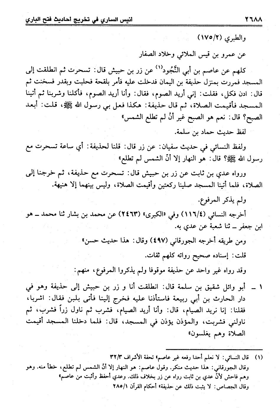 ولفظ النسائي في حديث سفيان: عن زر قال: قلنا لحذيفة: أي ساعة تسحرت مع رسول الله - صلى الله عليه وسلم -؟ قال: هو النهار إلا أنّ الشمس لم تطلع"