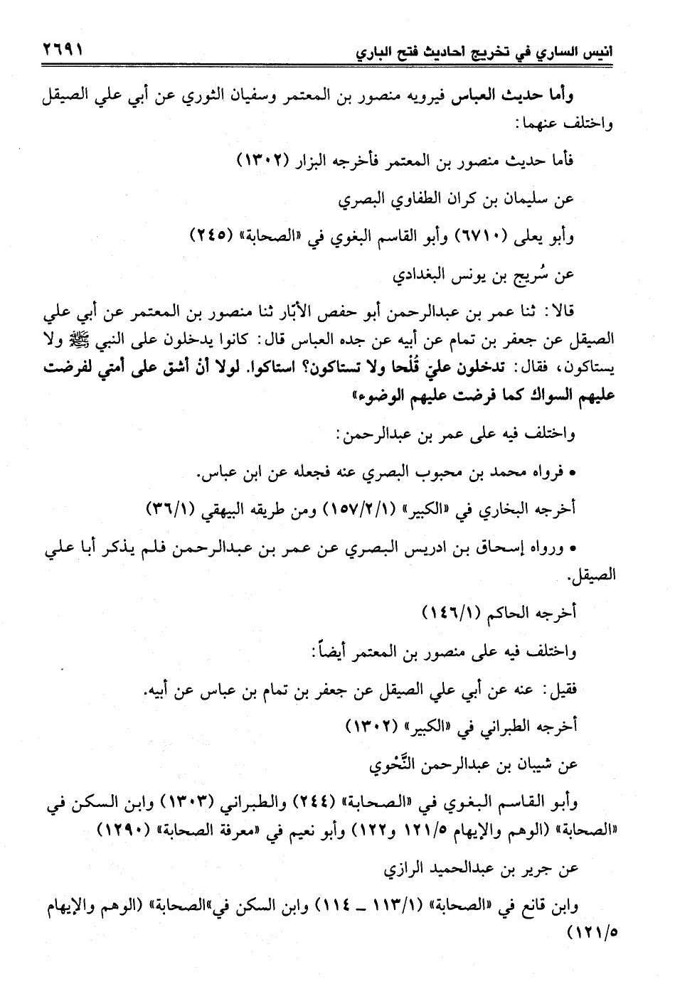 قالا: ثنا عمر بن عبد الرحمن أبو حفص الأبّار ثنا منصور بن المعتمر عن أبي علي الصيقل عن جعفر بن تمام عن أبيه عن جده العباس قال: كانوا يدخلون على النبي - صلى الله عليه وسلم - ولا يستاكون، فقال: تدخلون عليّ قُلْحا ولا تستاكون؟ استاكوا. لولا أنْ أشق على أمتي لفرضت عليهم السواك كما فرضت عليهم الوضوء"