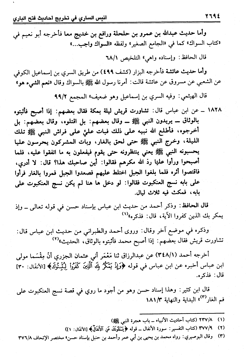 قال ابن كثير: وهذا إسناد حسن وهو من أجود ما روي في قصة نسج العنكبوت على فم الغار (¬3) " البداية والنهاية 3/ 181