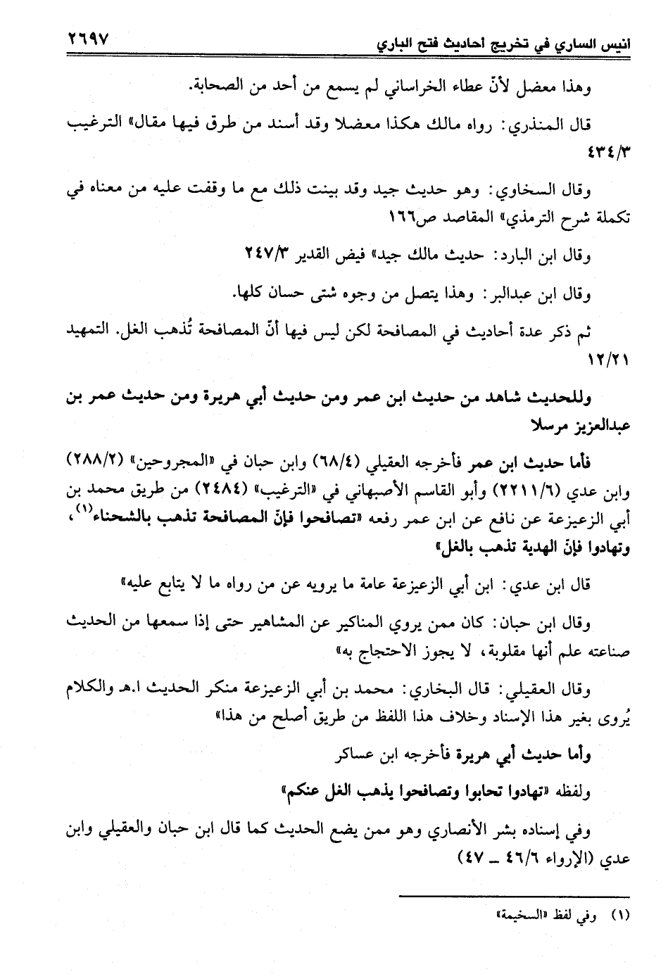 ثم ذكر عدة أحاديث في المصافحة لكن ليس فيها أنّ المصافحة تُذهب الغل. التمهيد 21/ 12