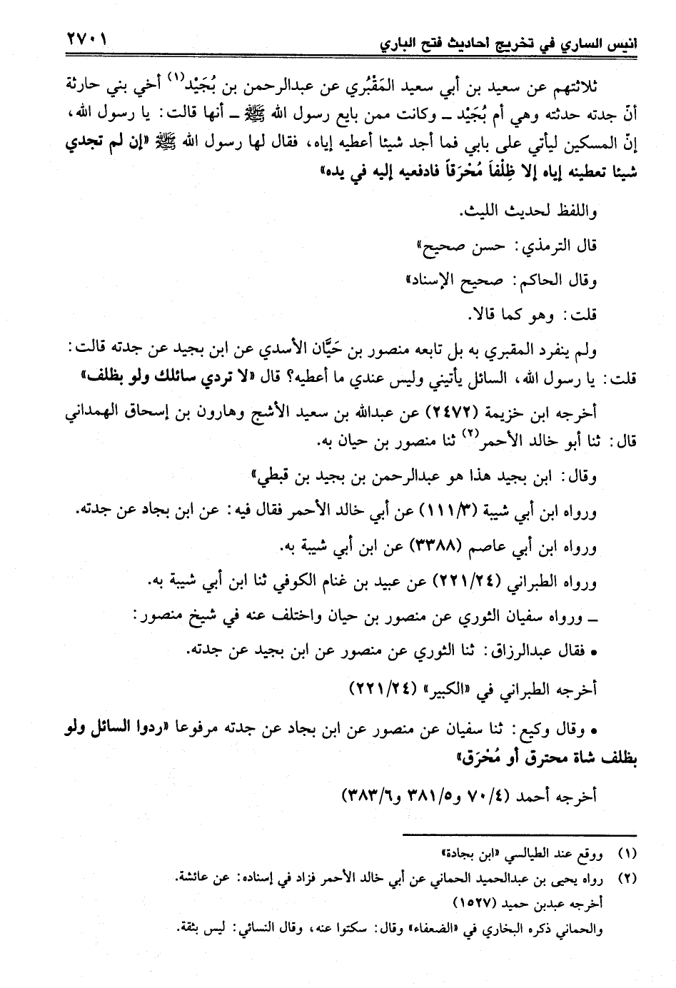 ولم ينفرد المقبري به بل تابعه منصور بن حَيَّان الأسدي عن ابن بجيد عن جدته قالت: قلت: يا رسول الله، السائل يأتيني وليس عندي ما أعطيه؟ قال "لا تردي سائلك ولو بظلف"