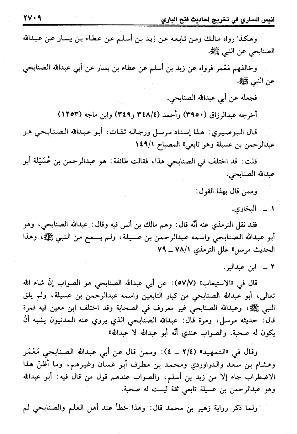 قال في "الاستيعاب" (7/ 57): عن أبي عبد الله الصنابحي هو الصواب إنْ شاء الله تعالى، أبو عبد الله الصنابحي من كبار التابعين واسمه عبد الرحمن بن عسيلة، ولم يلق النبي - صلى الله عليه وسلم -، وعبد الله الصنابحي غير معروف في الصحابة وقد اختلف ابن معين فيه فمرة قال: حديثه مرسل، ومرة قال: عبد الله الصنابحي الذي يروي عنه المدنيون يشبه أنْ يكون له صحبة. والصواب عندي أنّه أبو عبد الله لا عبد الله"