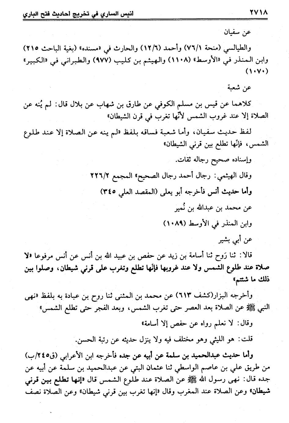 كلاهما عن قيس بن مسلم الكوفي عن طارق بن شهاب عن بلال قال: لم يُنه عن الصلاة إلا عند غروب الشمس لأنّها تغرب في قرن الشيطان"