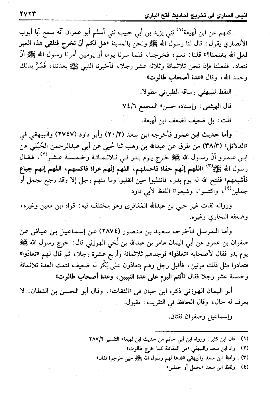 وأما المرسل فأخرجه سعيد بن منصور (2874) عن إسماعيل بن عياش عن صفوان بن عمرو عن أبي اليمان عامر بن عبد الله بن لُحَي الهوزني قال: خرج رسول الله - صلى الله عليه وسلم - يوم بدر فقال لأصحابه "تعادّوا" فوجدهم ثلاثمائة وأربع عشرة رجلا، ثم قال لهم "تعادّوا" فتعادوا مثل ذلك مرتين، فأقبل رجل وهم يتعادّون على بَكْر له ضعيف فتمت العدة ثلاثمائة وخمسة عشر رجلا فقال "أنتم اليوم على عدة النبيين، وعدة أصحاب طالوت"