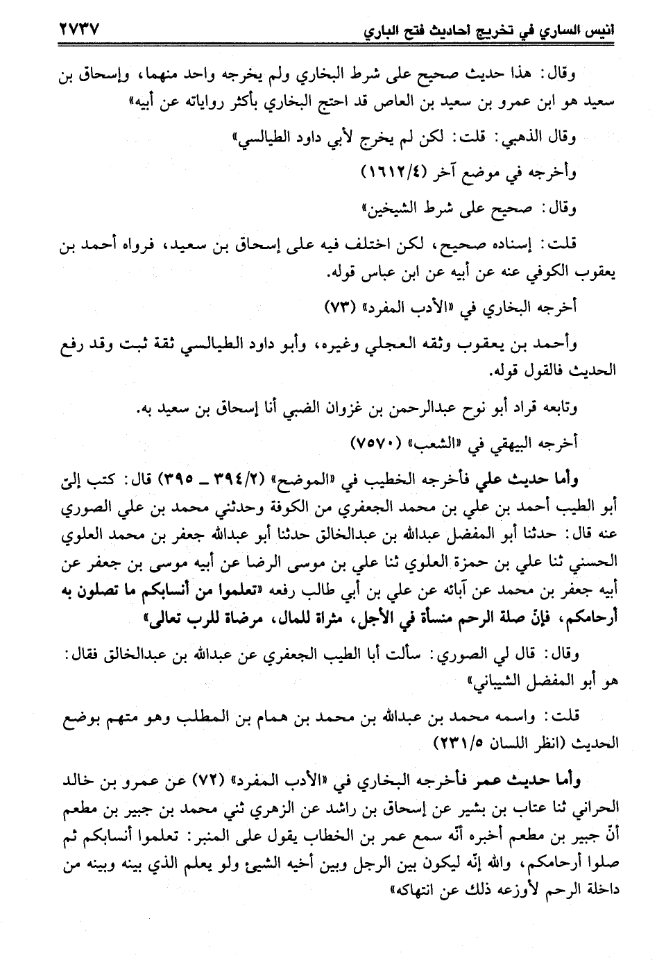 وأما حديث عمر فأخرجه البخاري في "الأدب المفرد" (72) عن عمرو بن خالد الحراني ثنا عتاب بن بشير عن إسحاق بن راشد عن الزهري ثني محمد بن جبير بن مطعم أنّ جبير بن مطعم أخبره أنه سمع عمر بن الخطاب يقول على المنبر: تعلموا أنسابكم ثم صلوا أرحامكم، والله إنه ليكون بين الرجل وبين أخيه الشيء ولو يعلم الذي بينه وبينه من داخلة الرحم لأوزعه ذلك عن انتهاكه"